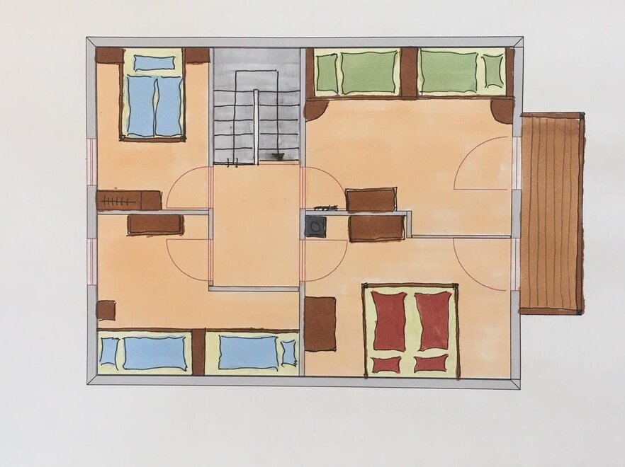 Úžasné pokoje s chalupářským kouzlem, čtyři ložnice v patře, každá pro dvě osoby, 4x jednolůžka, jedno manželské lůžko má šířku 140 cm, druhé 160 cm, jedna ložnice v přízemí pro jednu osobu, prostorná obytná kuchyň