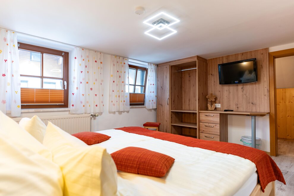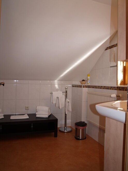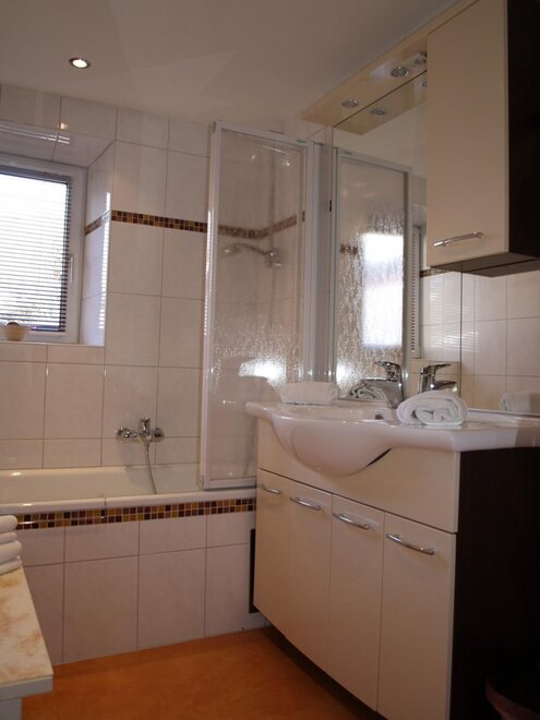 Dobře vybavená kuchyň, obývací/jídelní pokoj s TV, bezplatné W-LAN, malá ložnice se 2 samostatnými postelemi, dvě koupelny, dvě toalety, 2 rodinné pokoje s manželskou postelí a jednou širokou jednolůžkovou postelí 140 cm širokou (jednou v té samé místnosti a jednou odděleně dveřmi)