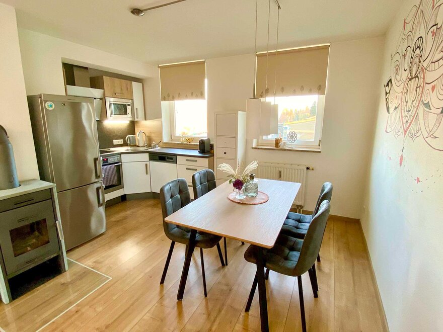 kuchyňské nádobí, jídelna, povlečení k dispozici, dřevěná/parketpvá podloha, detektor kouře, základy (Ručníky, povlečení, mýdlo a toaletní papír), nový pokoj, centrální topení, hasicí přístroj, vlasový fén, trouba, topení, kamna na dřevo, toaletní potřeby, nekuřácký pokoj, kávovar, elektrický krb, dlažba nebo mramorová podlaha, myčka nádobí, lednice, možnost vaření, kuchyň, skříň, Größe m²: 57, balkón, balkonový nábytek, obývací pokoj, terasa, přikrývky, vestavěná kuchyň, varná konvice, domácí zvířata nedovolena, zahradní nábytek, kuchyňský kout, mrazicí box, pokoj/apartmán v tiché zóně, prošívané deky, TV, dřez na mytí nádobí, nádobí k dispozici, store room, možnost mražení potravin, satelitní TV, digestoř, dětská židle, zásuvka u postele, ručníky k dispozici, mikrovlnná trouba, mikrovlnná trouba, WiFi