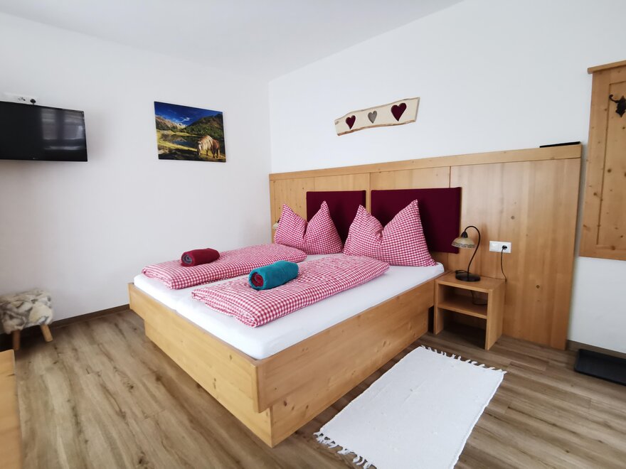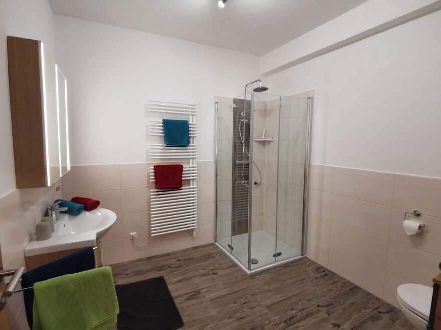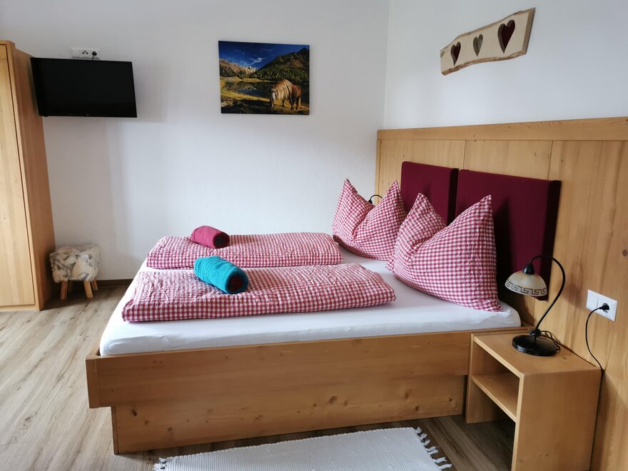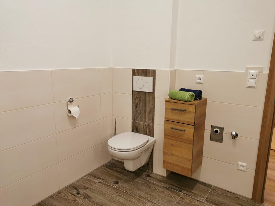 The holiday apartment “Zum Jäger” is a wellness oasis for up to 6 people. Enjoy relaxing hours in our spacious living-dining area, treat yourself to a visit to the infrared cabin, or share your holiday experiences with friends via the internet (free Wi-Fi). Our fully equipped kitchen with a large dining table or our large balcony with seating invites socializing. The two bedrooms are equipped with double beds, and in the living area, you will find a pull-out couch. In the spacious bathroom, you save time in the morning; with a separate toilet and two sinks, you are twice as fast on the slopes or mountains.