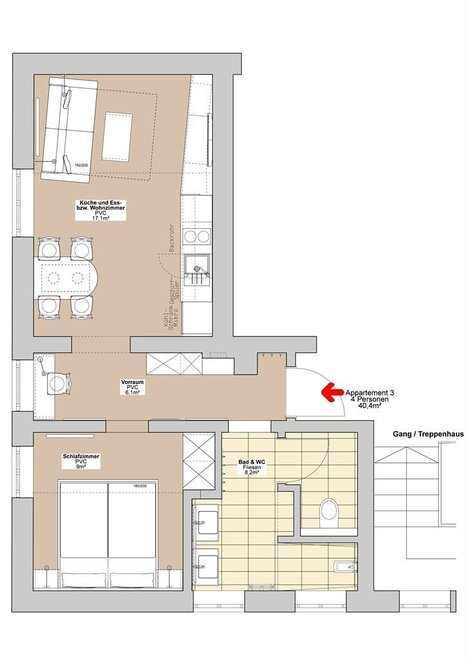 - Obývací pokoj s plně vybaveným kuchyňským koutem, lednicí s malým mrazákem, kávovarem s filtrem, varnou konvicí, myčkou nádobí, troubou, sklokeramickou deskou, mikrovlnnou troubou, jídelním stolem se židlemi, rozkládací pohovkou, SAT-TV, sejfem, WLAN
