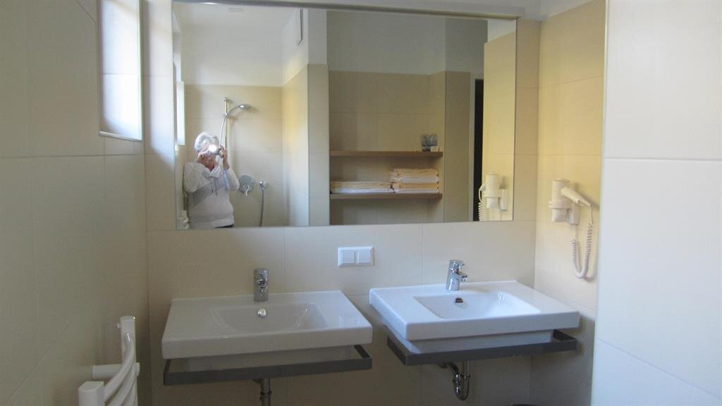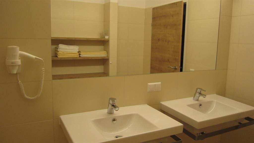 - Koupelna s dvojitým umyvadlem, sprchou, fénem a sušákem na ručníky