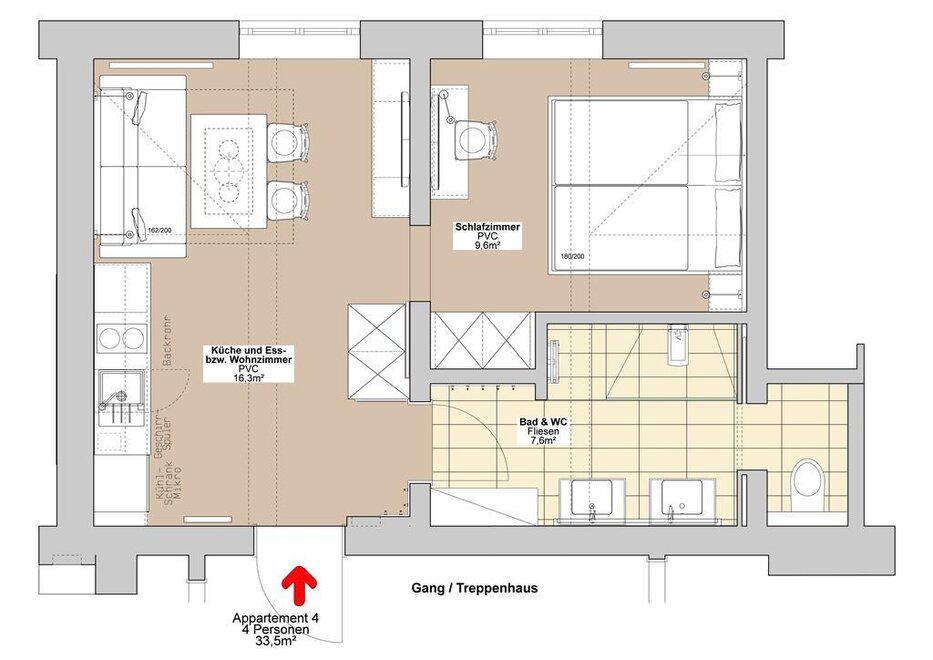společný obýv./ložnice, rodinný pokoj, digestoř, bez koberce, Größe m²: 34, centrální topení, zahrada, mikrovlnná trouba, domácí zvířata nedovolena, vlasový fén, myčka nádobí, WiFi, nádobí k dispozici, prostírání a prádlo do kuchyně, sejf, balkón, varná konvice, základy (Ručníky, povlečení, mýdlo a toaletní papír), nekuřácký pokoj, mrazicí box, lednice, moderní vybavení nábytkem, dřez na mytí nádobí, satelitní TV, balkonový nábytek, louka, psací stůl, trouba, obytná kuchyň, zahradní nábytek, vestavěná kuchyň, samostatná ložnice: 1, kávovar, elektrický krb, topení, neuzamykatelný byt