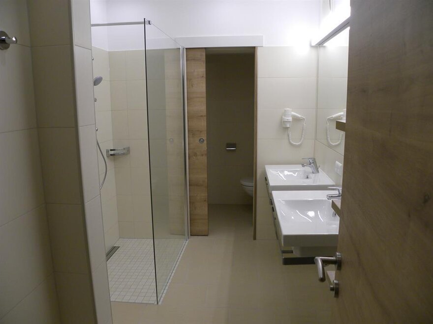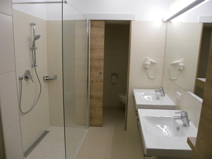Koupelna s dvojitým umyvadlem, sprchou, WC, fénem a sušičem ručníků,