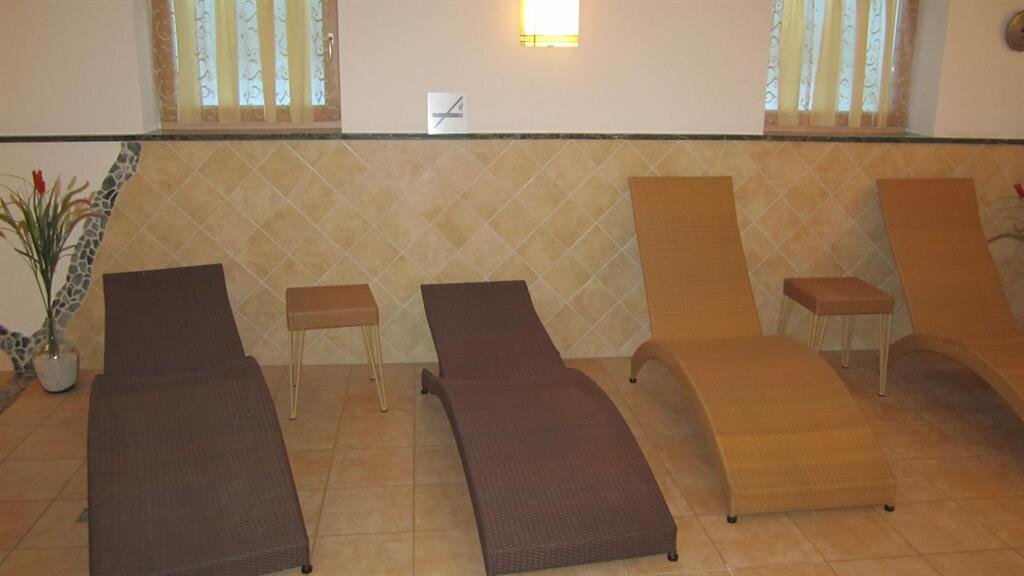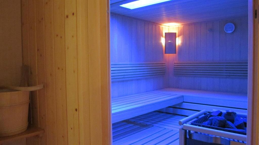 - Obývací pokoj s kompletně zařízeným kuchyňským koutem, ledničkou s malým mrazákem, kávovarem na filtr, rychlovarnou konvicí, myčkou nádobí, troubou, sklokeramickou deskou, mikrovlnnou troubou, jídelním stolem se židlemi, rozkládací pohovkou, SAT-TV, psacím stolem, sejfem, WLAN