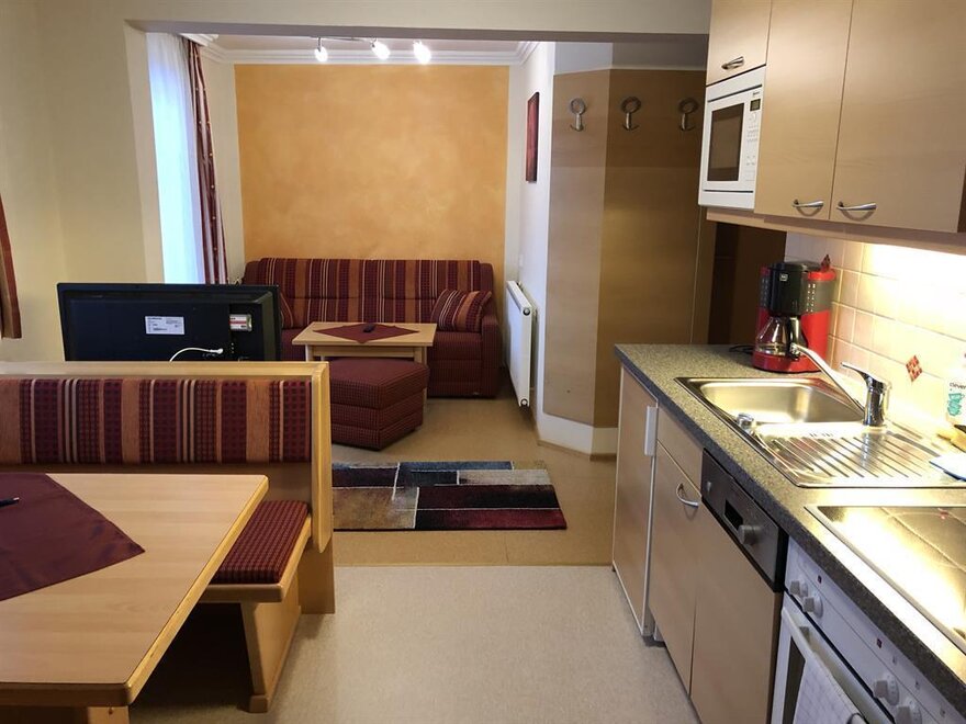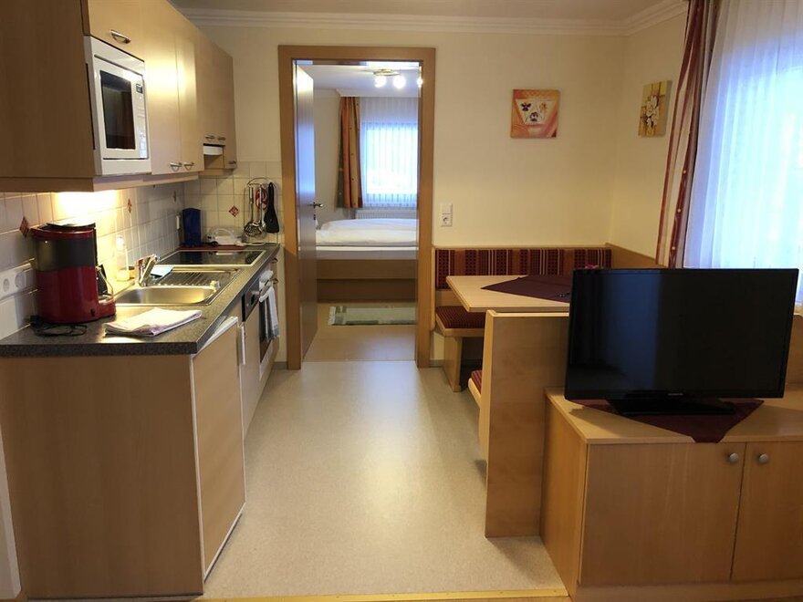 Byt na dovolenou o rozloze cca 40 m² pro 2 osoby. Plně vybavená kuchyň s elektrickým sporákem, mikrovlnnou troubou, troubou, myčkou na nádobí, rychlovarnou konvicí, kávovarem. Obývací prostor s plochou TV, satelitním připojením, bílým prádlem v ceně. zdarma W-Lan