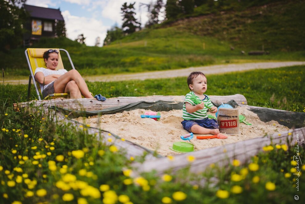 V létě je chata obklopena oplocenou zahradou s dřevěnou studnou. Naši hosté mají navíc k dispozici posezení, lehátka a gril (uhlí na gril si prosím vezměte s sebou) k volnému použití.
