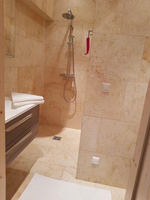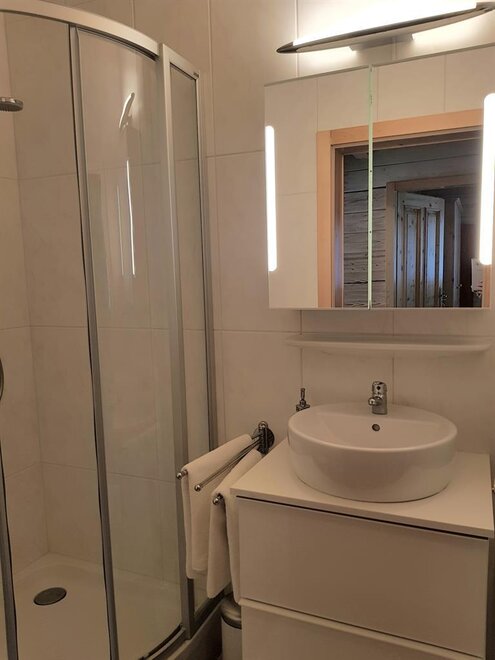 Koupelna je zařízena v moderním stylu se sprchou a WC.Vybavení pokojů