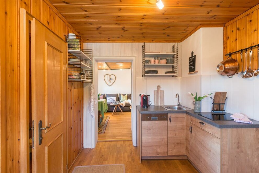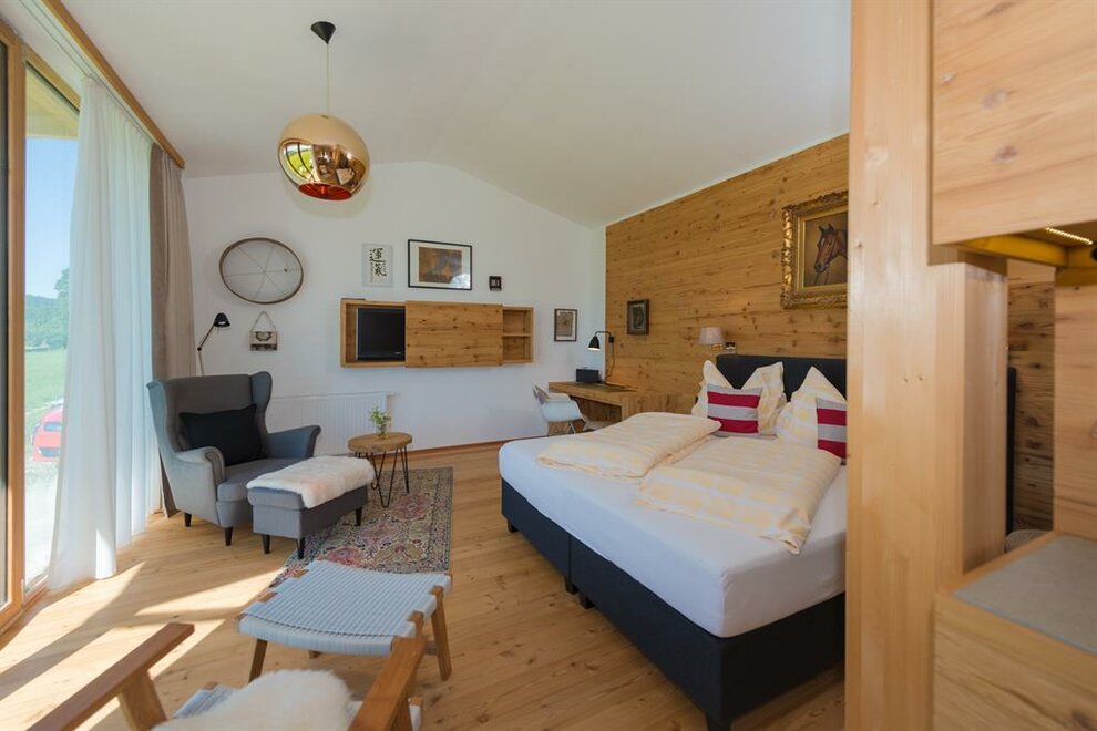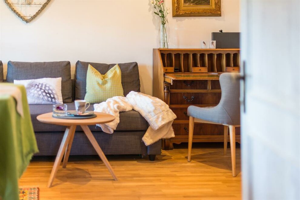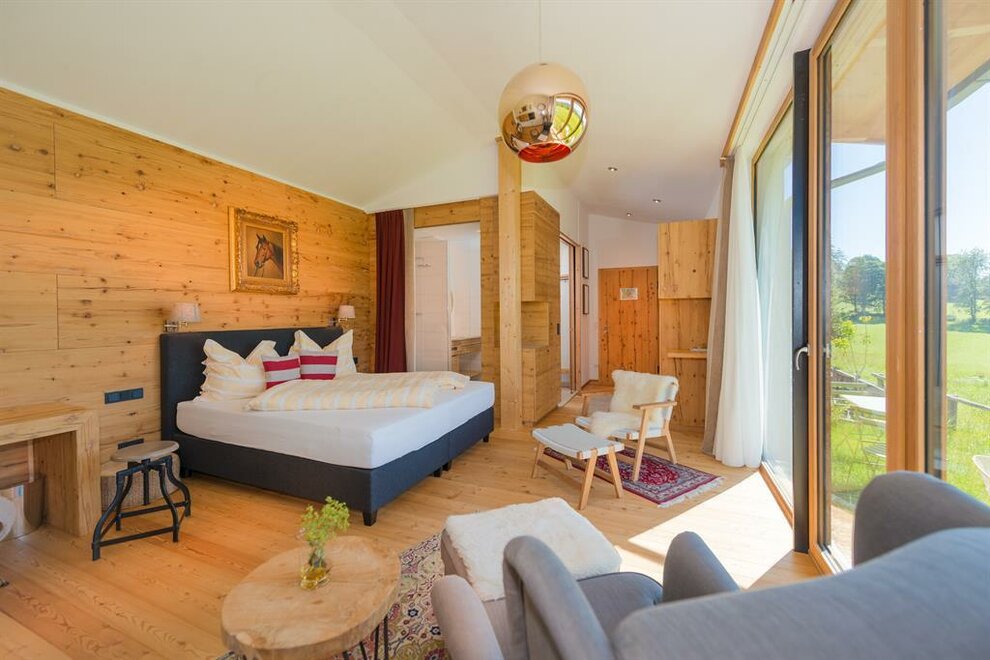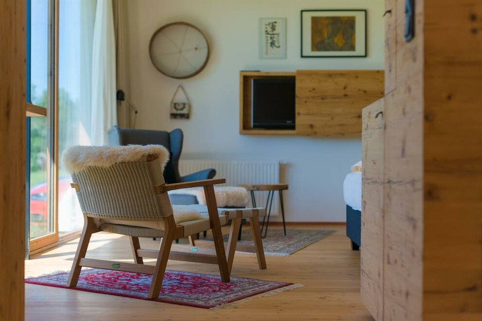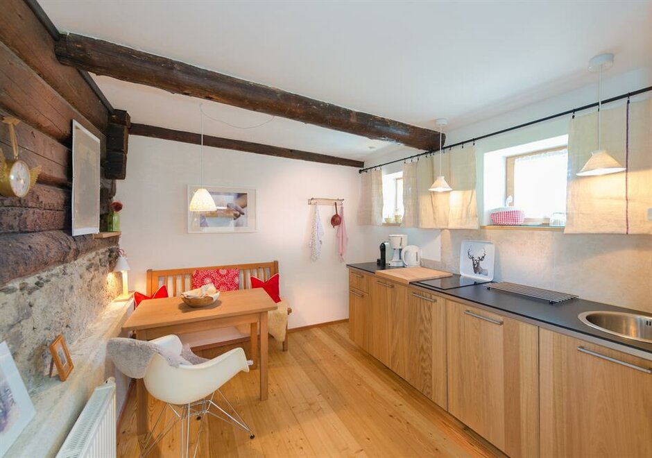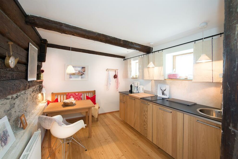 Apartmán pro pohodlí (suite) Zuhäus’l - Ideální pro páry, které si chtějí dopřát zvláštní dřevěný dům! Nekuřácký apartmán pro 2 osoby, 60 m² / úžasná, soukromá, zčásti zastřešená jihovýchodní terasa s nádherným výhledem / útulná kuchyň s jídelním koutem ve staré části / světlá koupelna se sprchou / extra WC / bezplatné LAN připojení k internetu / TV a rádio Moderní, aniž by byl chladný – to je náš jednoduchý elegantní přírodní styl. Přímé linie a syté barvy. Velká skleněná stěna a pohled na hory – přímo z postele! Tradičně útulný – k tomu patří i obytná kuchyň. - Ideální pro vás, pokud chcete z běžkařské stopy rovnou do postele!
