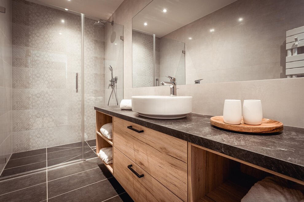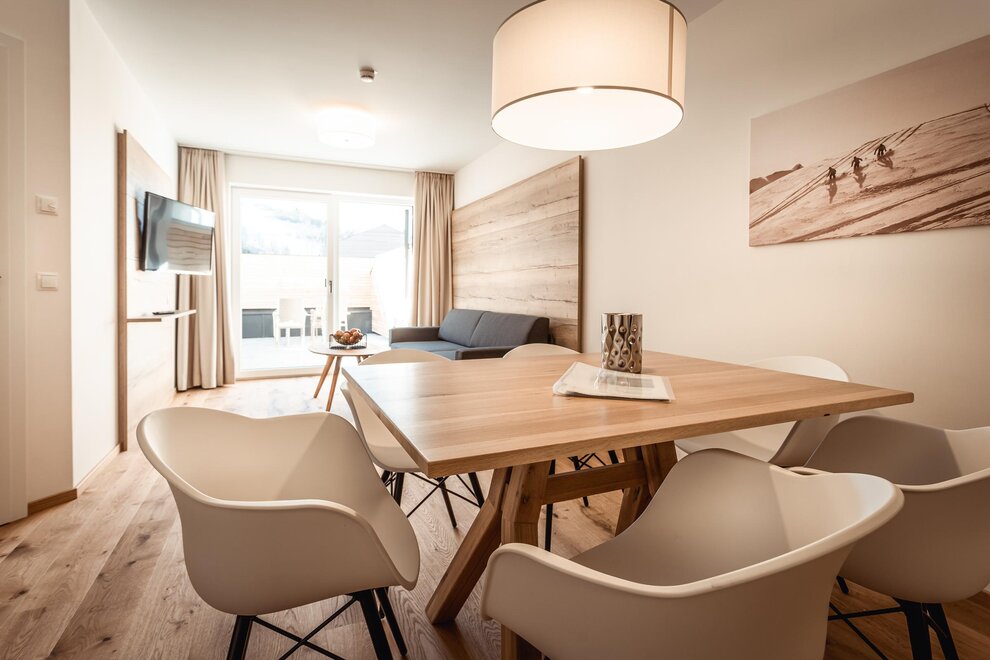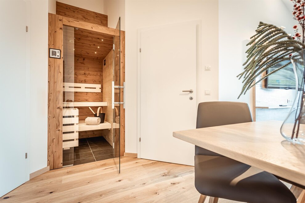 Jednoduše vše, co potřebuješ. Mimochodem: Auto můžeš nechat v podzemní garáži. Servus v Gustavu – 8 apartmánů od Smart po Sky – navíc k tomu: soukromá sauna v apartmánu, vlastní terasa nebo balkon, Top 8 nemá balkon, plně vybavené kuchyně se vším potřebným, 1-2 ložnice a koupelny a výhled na západ na Hochwurzen a to nějaké to Chi-Chi.