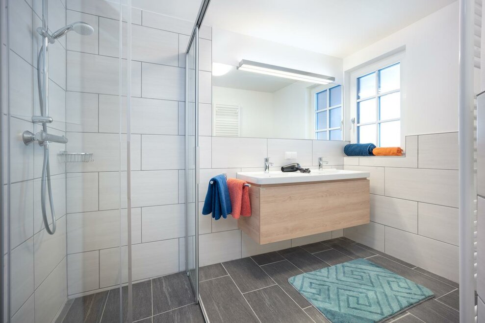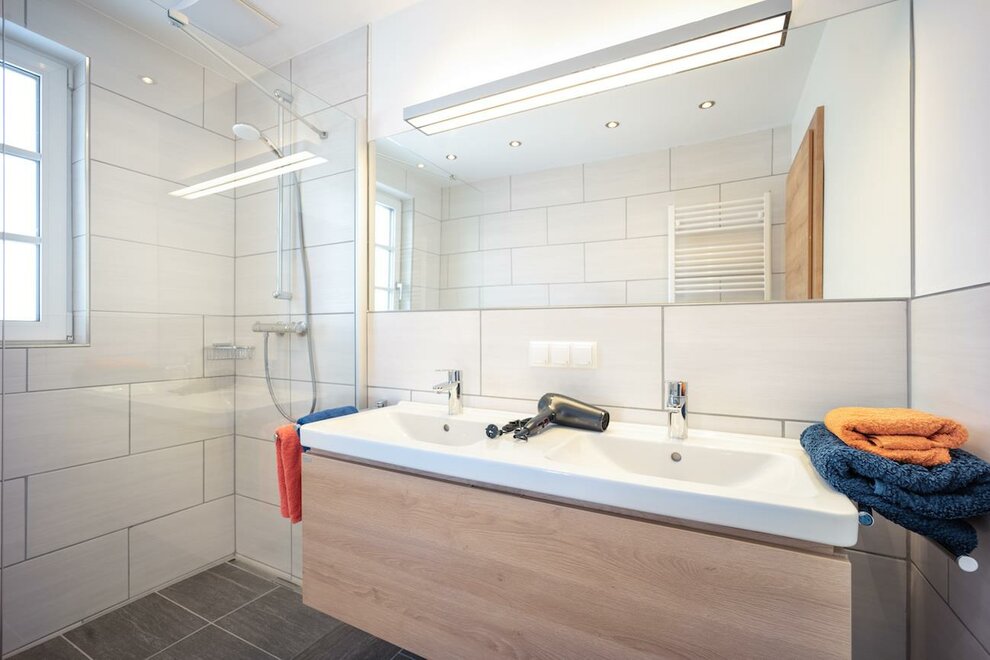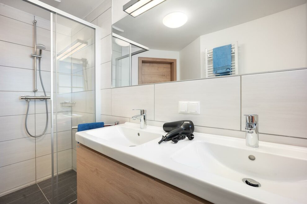 - Koupelna se sprchou, dvojitým umyvadlem a podlahovým topením