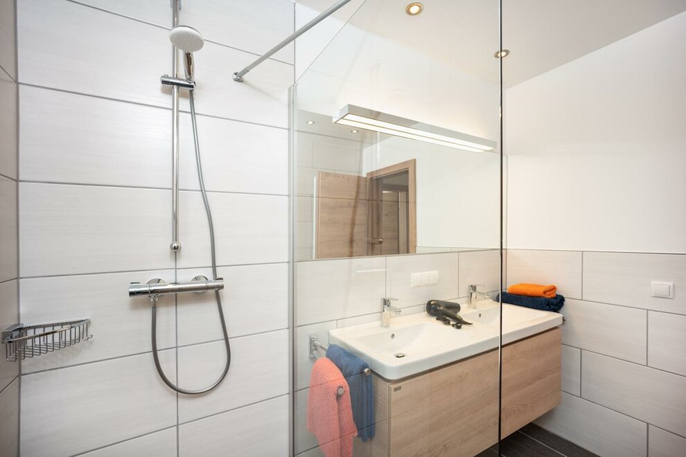 - Koupelna se sprchou, dvojitým umyvadlem a podlahovým vytápěním