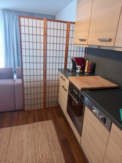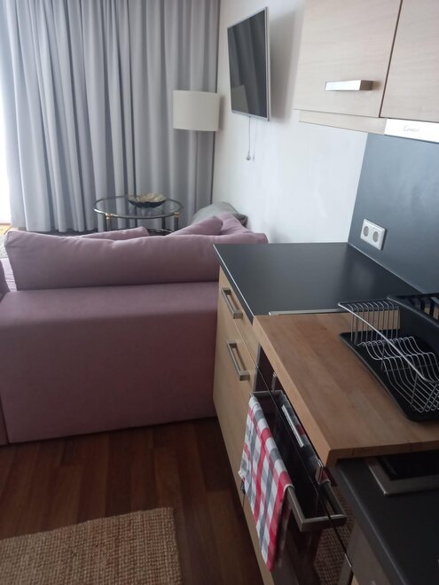 Smart-TV s WiFi internetem, myčka na nádobí, varná deska, mrazák, mikrovlnná trouba atd...Vedle boxspringové postele je kuchyňský kout vybaven pohodlnou pohovkou.