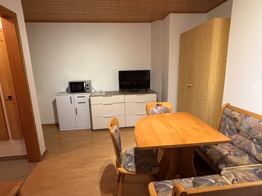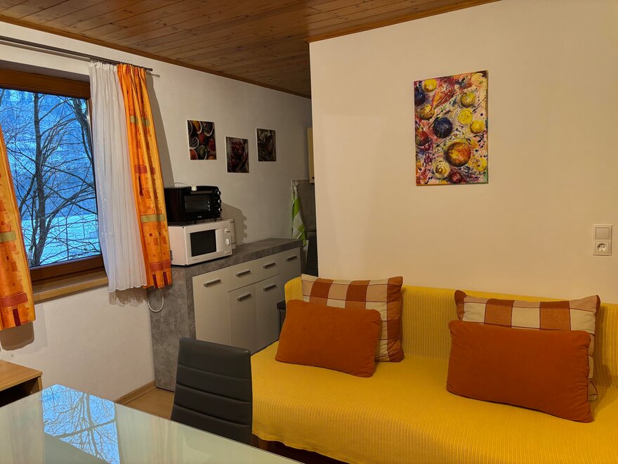 Jednopokojový apartmán pro 2 až 3 osoby s manželskou postelí a rozkládací pohovkou, SAT-TV, plně vybaveným kuchyňským koutem (kávovar, rychlovarná konvice, mikrovlnná trouba, toustovač atd.), sprcha/WC
