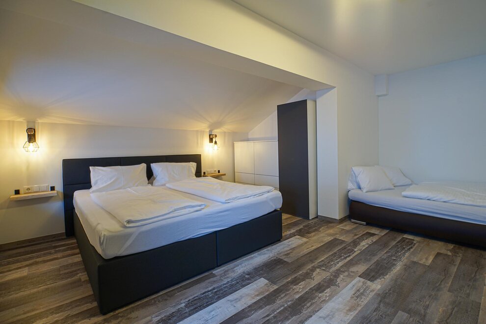 Velmi dobře vybavený apartmán se 5 pokoji, 3 dvoulůžkové pokoje, každý s sprchou/WC, balkon, ve 2 patrech. 103 m²
