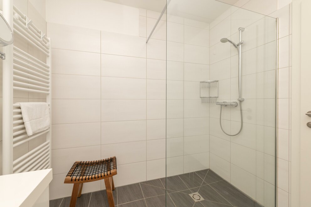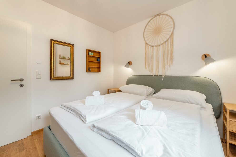 Apartmán nabízí s 2 ložnicemi (1x s manželskou postelí a 1x s manželskou postelí + patrovou postelí) místo pro až 6 osob. Světlý obývací pokoj s pohovkou, jídelním koutem a přístupem na balkon, stejně jako plně vybavená kuchyň, zajišťují komfortní pobyt. Apartmán také disponuje velkou koupelnou s bezbariérovým sprchovým koutem a vanou, stejně jako samostatnou toaletou. K dispozici je také velká komora.