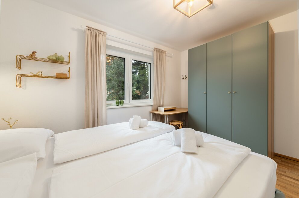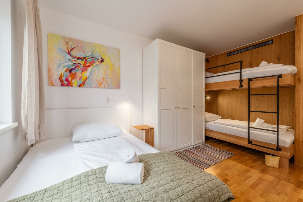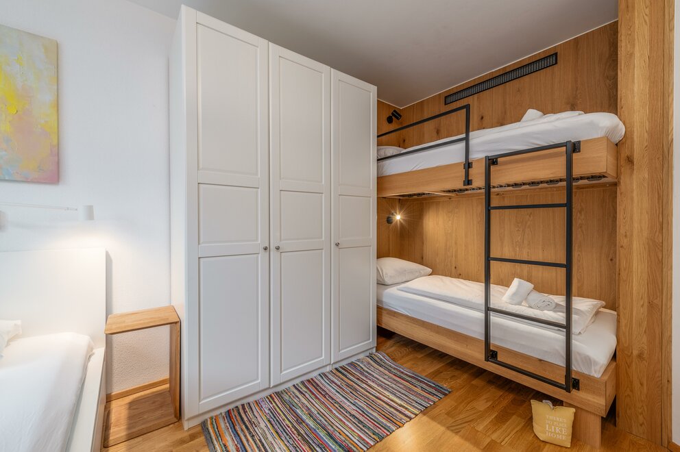 Plně vybavený apartmán s úchvatným výhledem nabízí místo až pro 6 osob ve 2 ložnicích (jedna s manželskou postelí a druhá s manželskou postelí a patrovou postelí). Velký, světlý obývací pokoj s útulnou pohovkou, jídelním koutem a přístupem na prostornou terasu, stejně jako plně vybavená kuchyň vám zajistí pohodlný pobyt. Apartmán navíc disponuje velkou koupelnou s bezbariérovým sprchovým koutem a vanou, stejně jako samostatnou toaletou. Pro vaše sportovní vybavení (např. lyže) je k dispozici velká úložna.