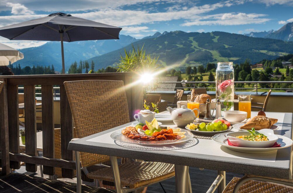 Začněte aktivní den a posilněte se naším snídaňovým bufetem s osvěžujícími džusy a bohatou čajovou barou. Všestranně navržený vitální koutek, chutné místní delikatesy, lákavá nabídka čerstvě pečeného chleba, rohlíků a závitků zvou k požitku. Kromě toho nabízíme bar s marmeládou, pomazánky, jogurt a tvaroh, stejně jako mléko z našeho vlastního bio farmy.