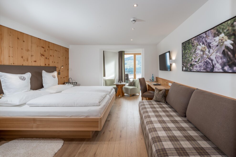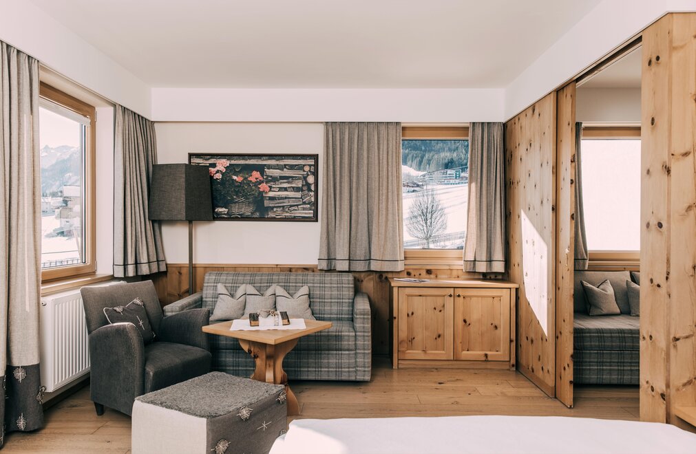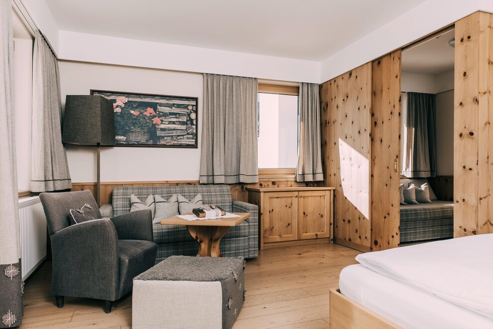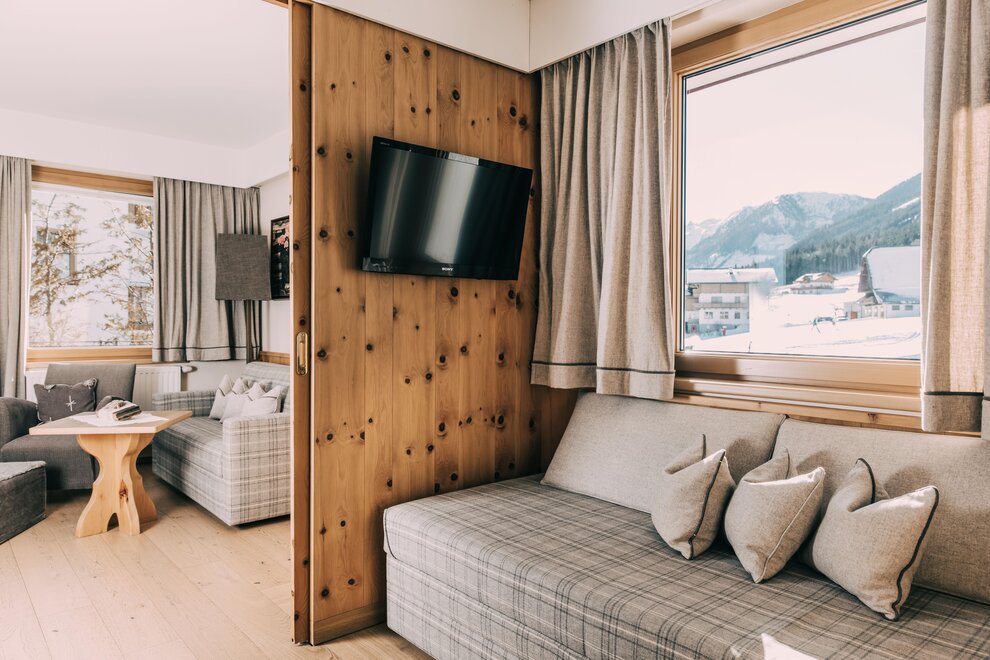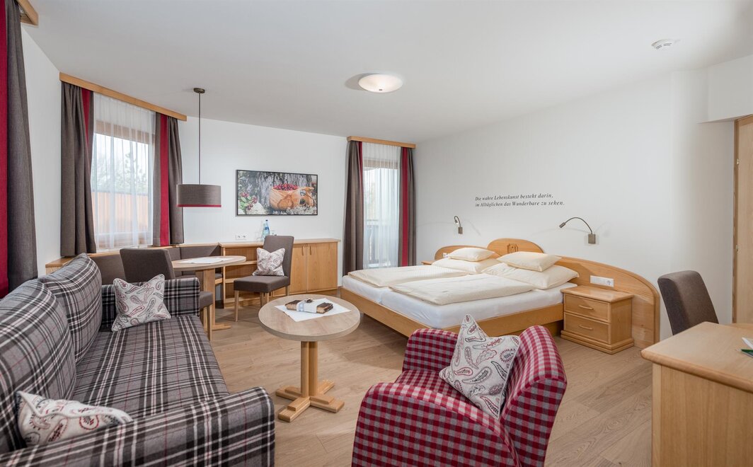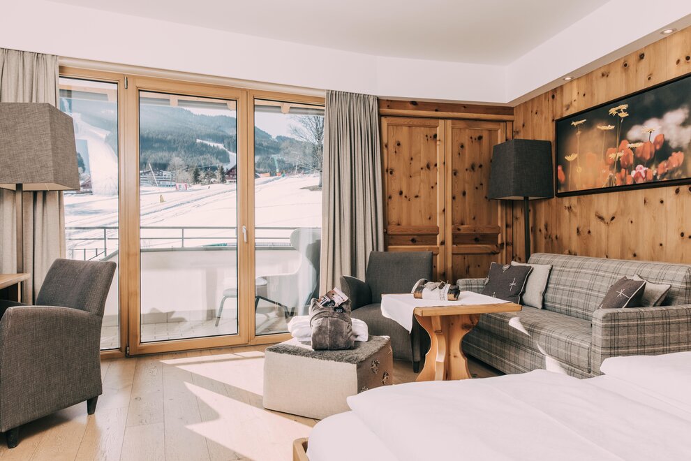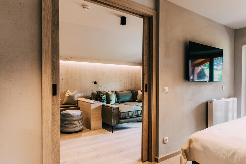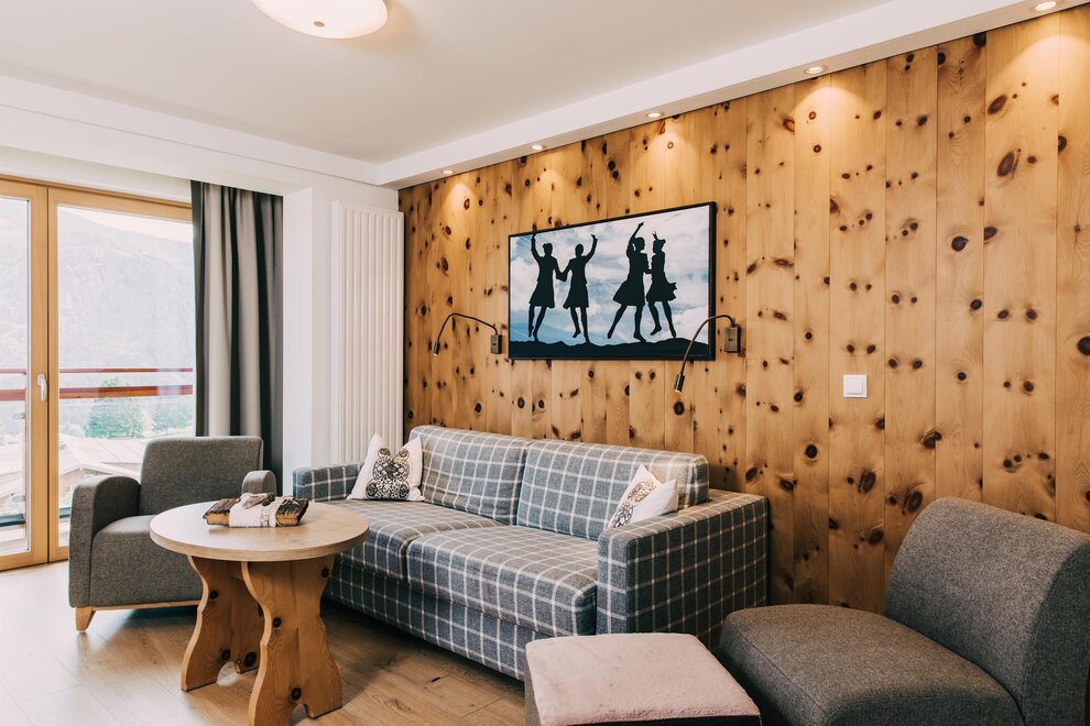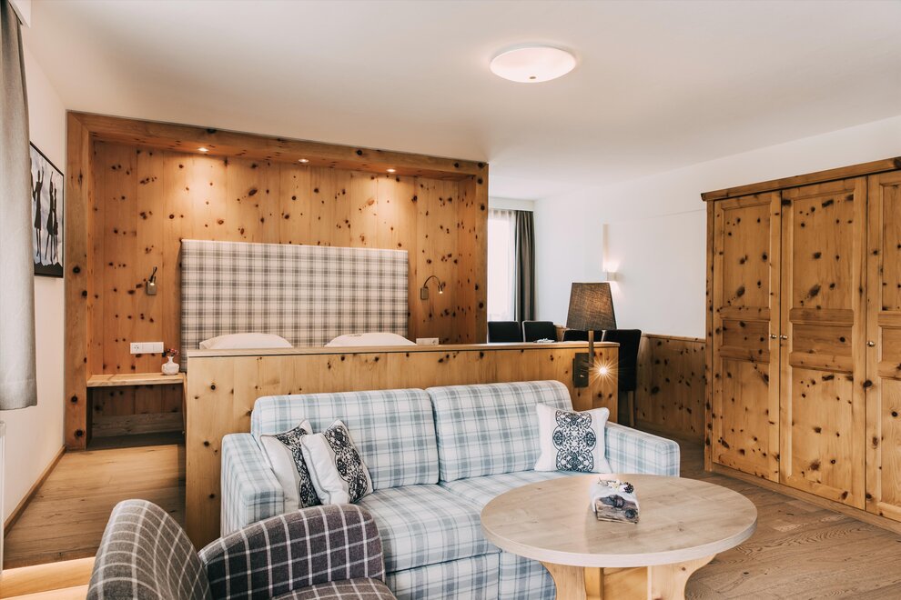 Prostorné apartmá v hlavní budově s jižním balkonem splňuje sny o dovolené. Protože vybavení z přírodního smrkového dřeva vytváří útulnou atmosféru a extra plochá obrazovka TV poskytuje zábavu v klidných dnech. Apartmá má oddělenou obytnou část. Koupelna se sprchou je oddělená od toalety a k dispozici je také kávovar na espresso a konvice na čaj.