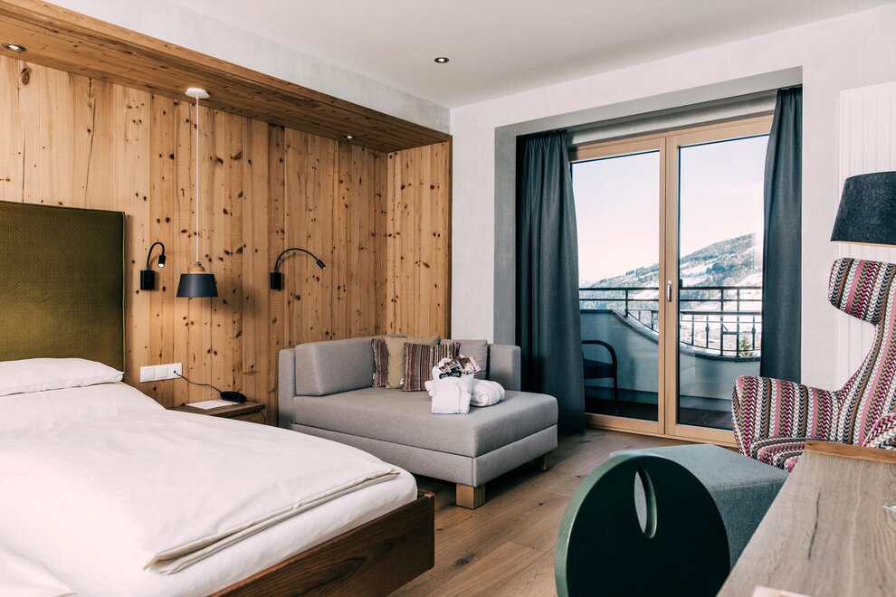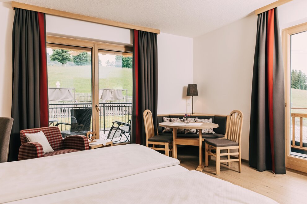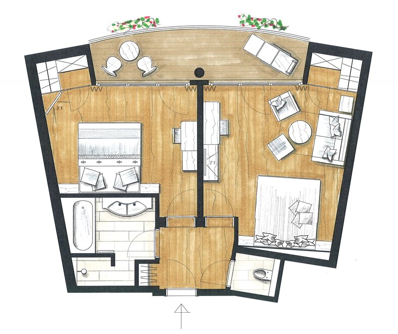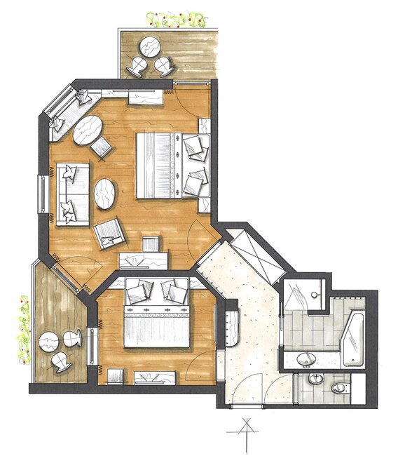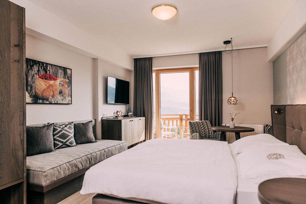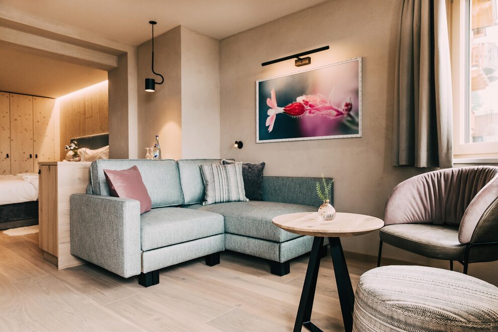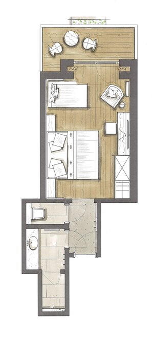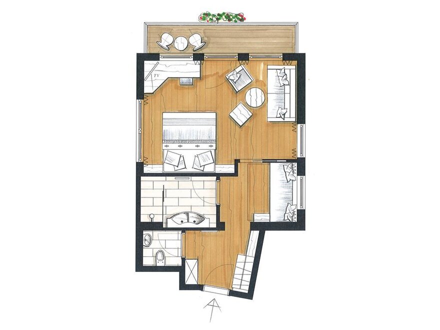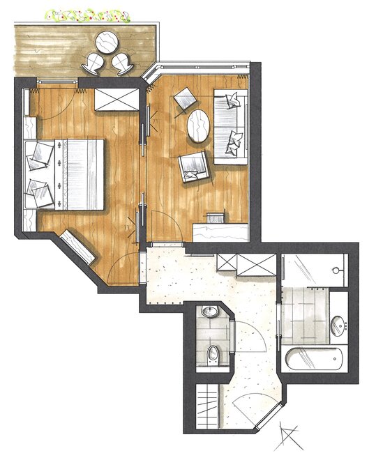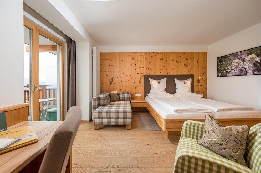 Prostorné apartmá v hlavní budově s jižním balkonem splňuje sny o dovolené. Protože vybavení z přírodního smrkového dřeva vytváří útulnou atmosféru a extra plochá obrazovka TV poskytuje zábavu v klidných dnech. Apartmá má oddělenou obytnou část. Koupelna se sprchou je oddělená od toalety a k dispozici je také kávovar na espresso a konvice na čaj.