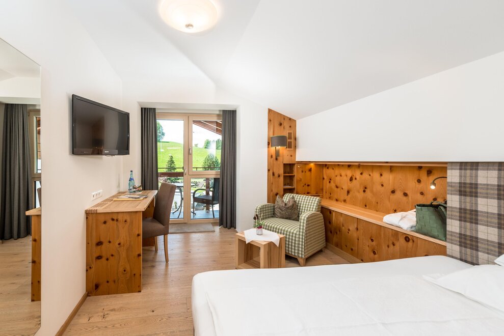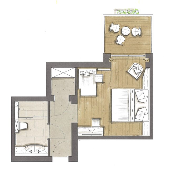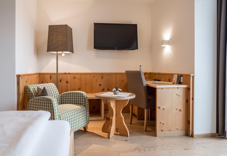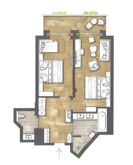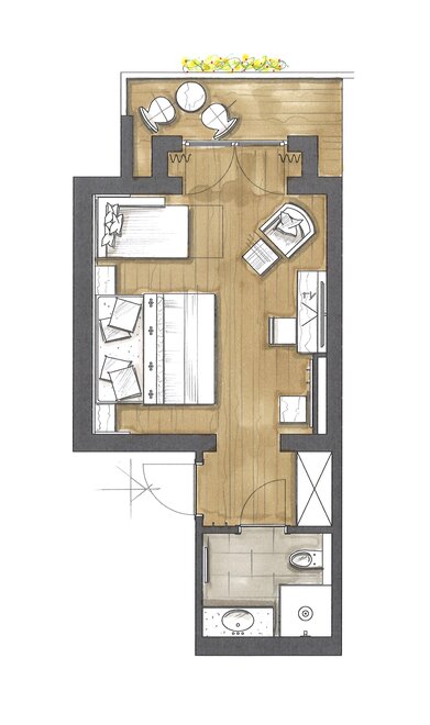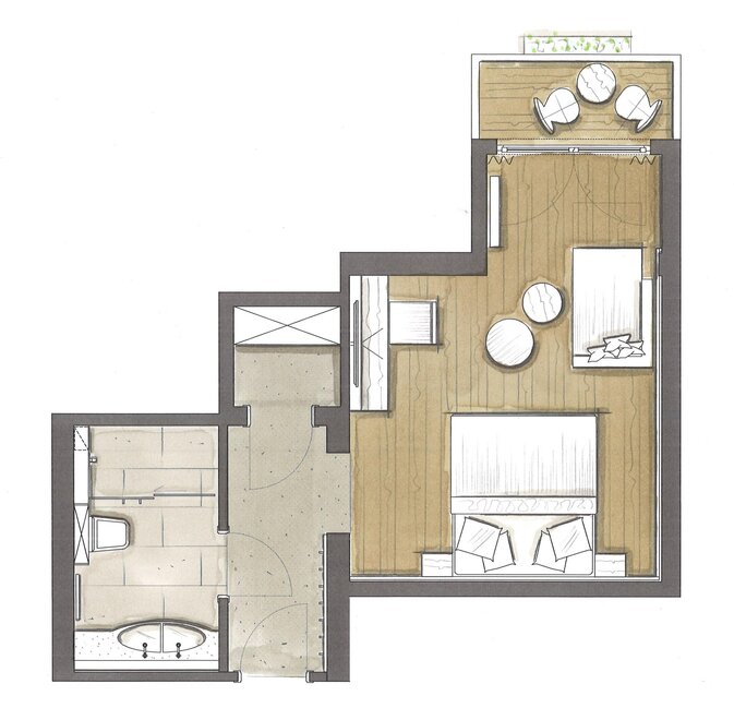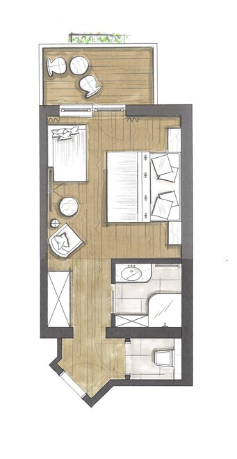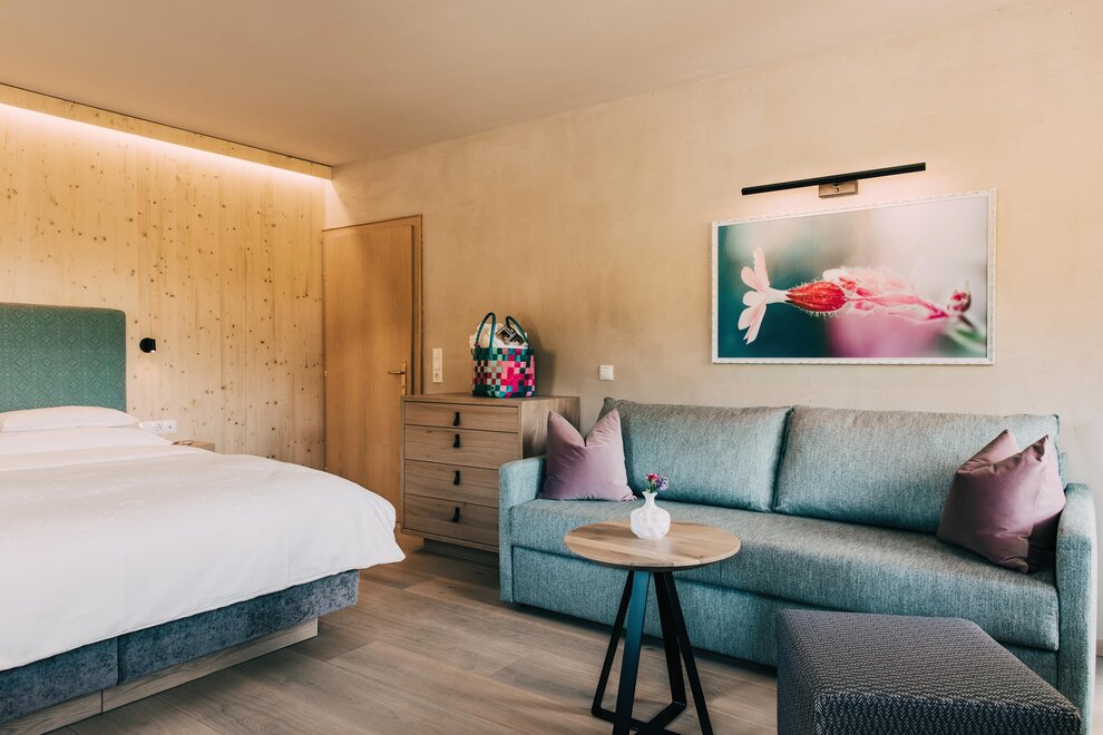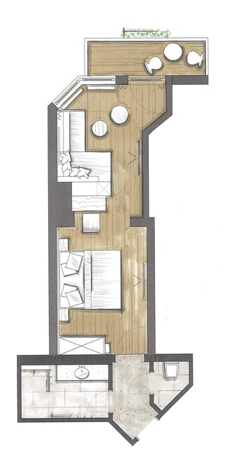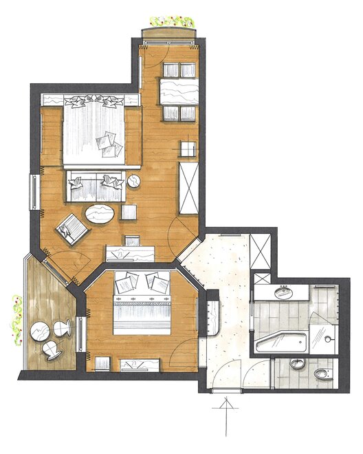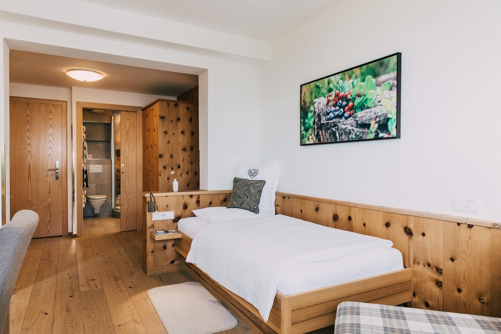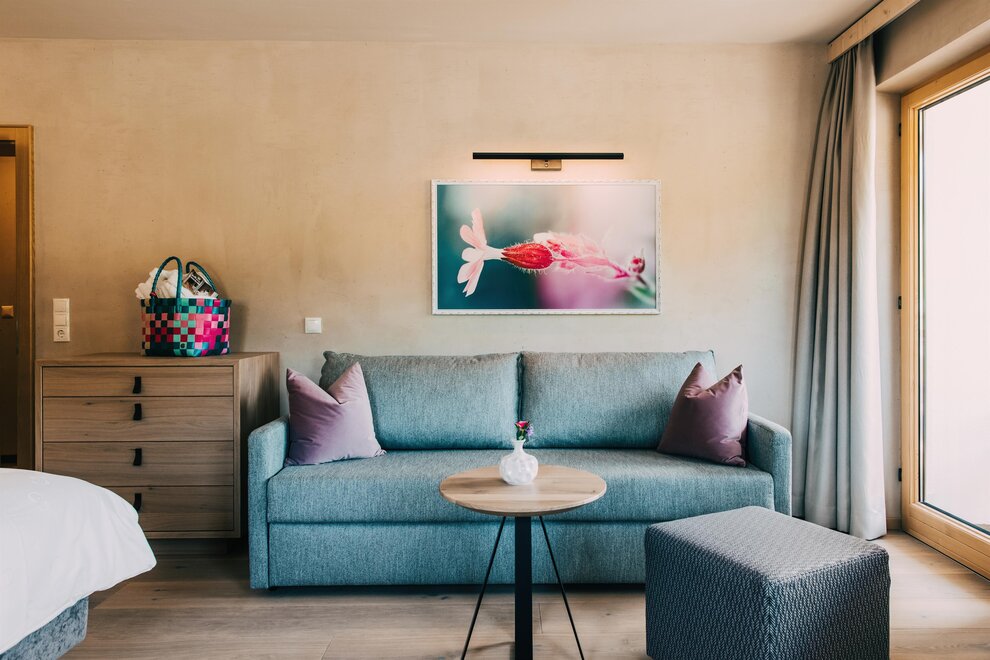 Prostorné apartmá v hlavní budově s jižním balkonem splňuje sny o dovolené. Protože vybavení z přírodního smrkového dřeva vytváří útulnou atmosféru a extra plochá obrazovka TV poskytuje zábavu v klidných dnech. Apartmá má oddělenou obytnou část. Koupelna se sprchou je oddělená od toalety a k dispozici je také kávovar na espresso a konvice na čaj.
