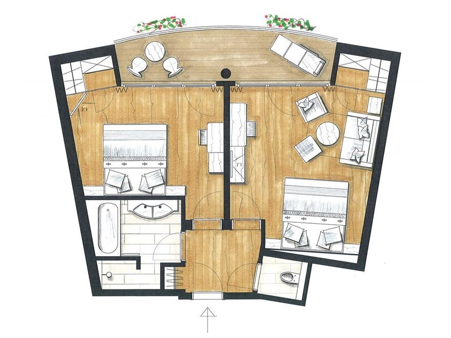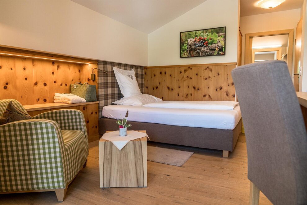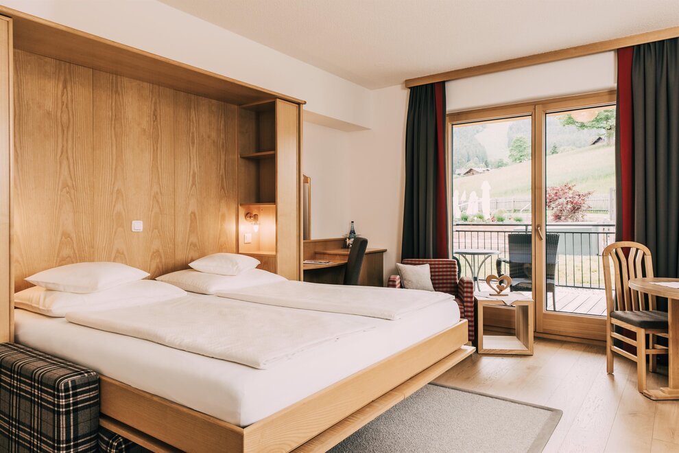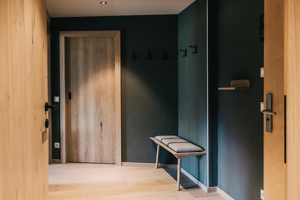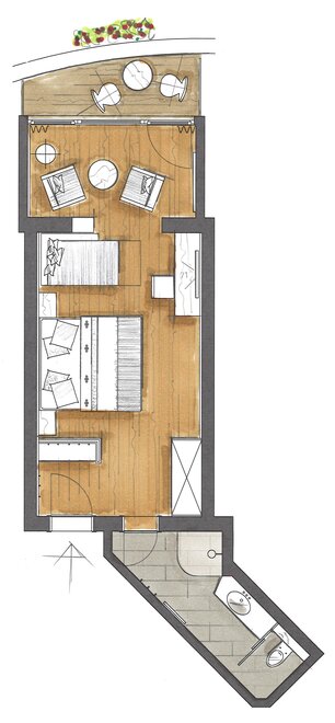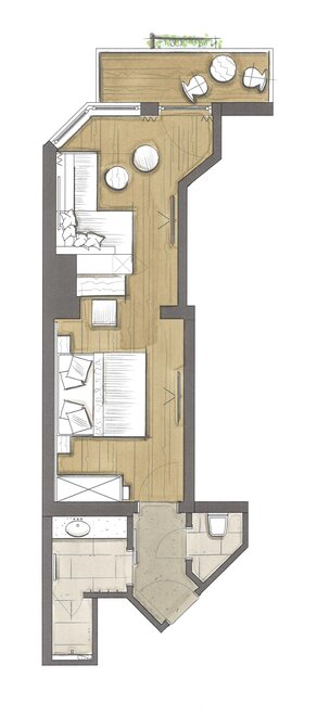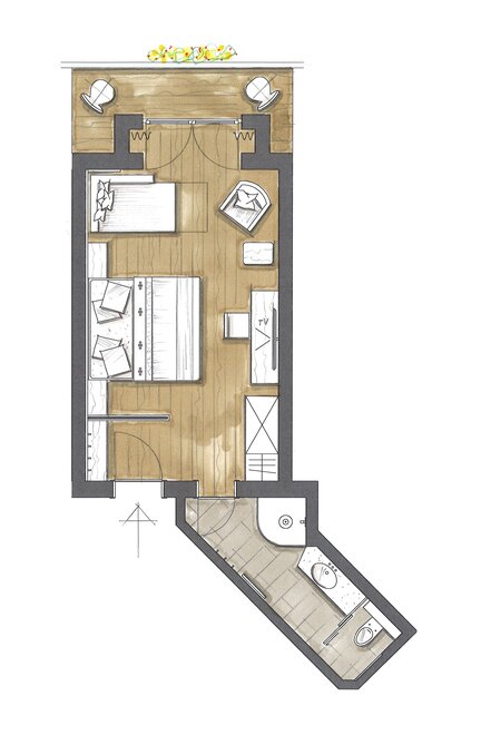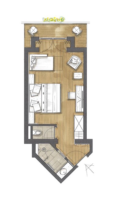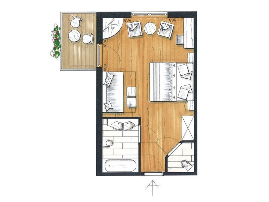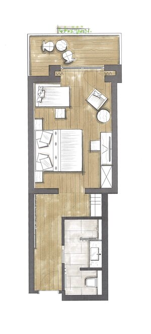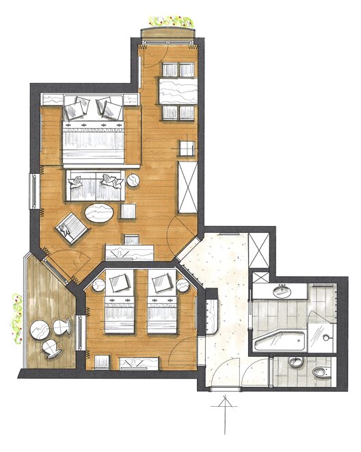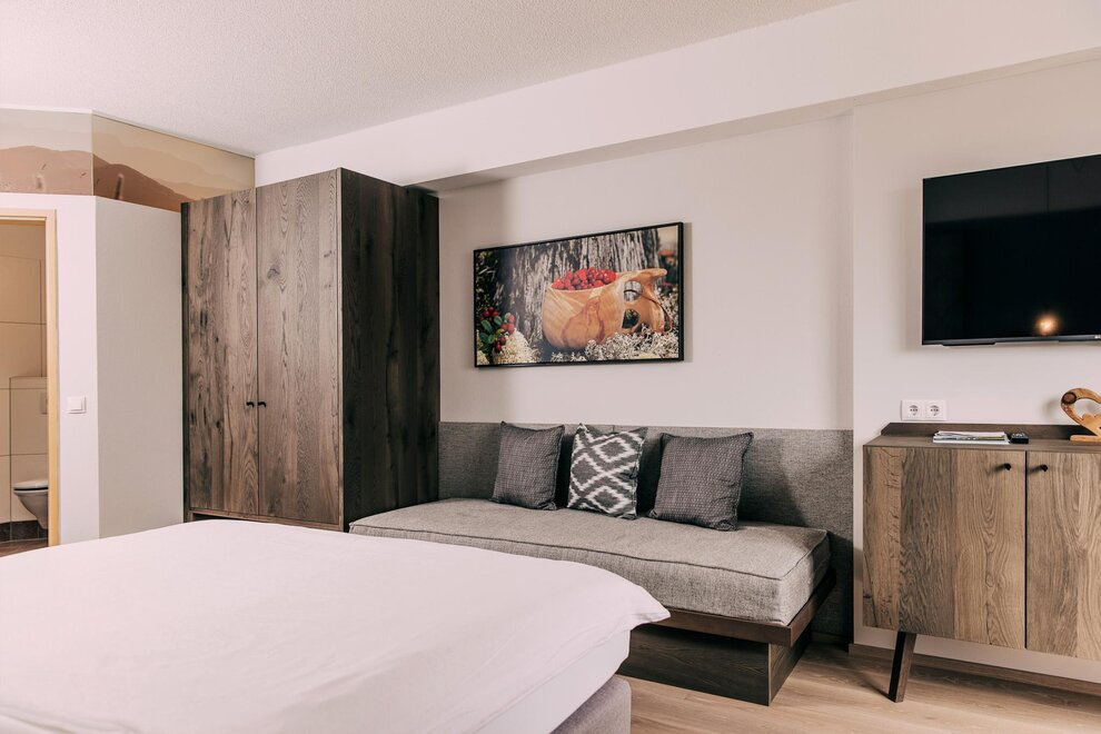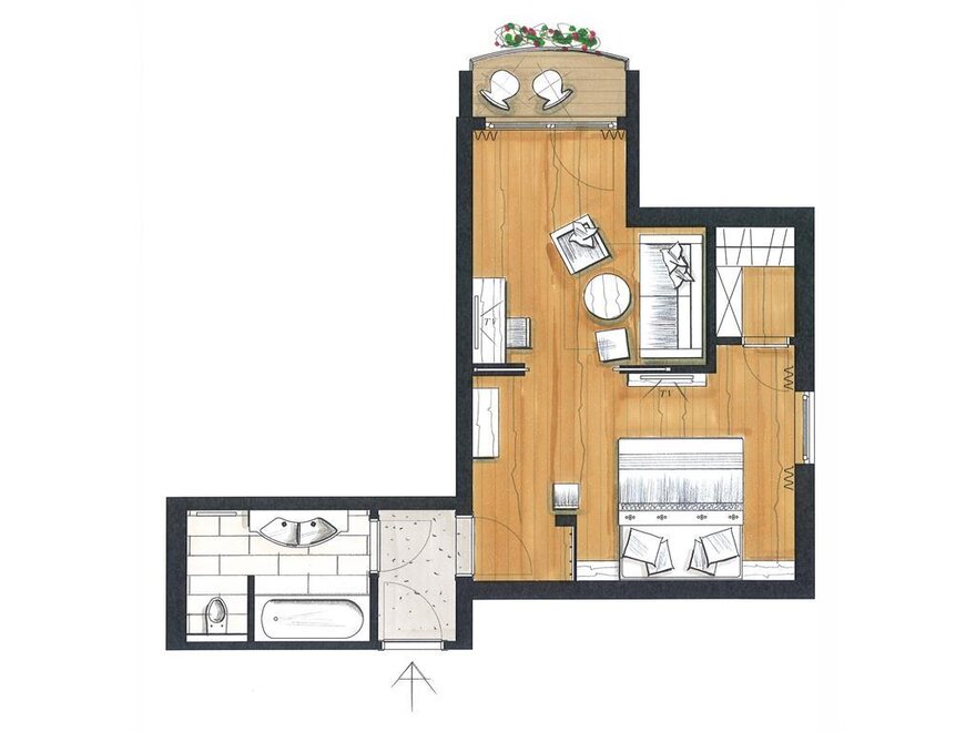 Prostorné apartmá v hlavní budově s jižním balkonem splňuje sny o dovolené. Protože vybavení z přírodního smrkového dřeva vytváří útulnou atmosféru a extra plochá obrazovka TV poskytuje zábavu v klidných dnech. Apartmá má oddělenou obytnou část. Koupelna se sprchou je oddělená od toalety a k dispozici je také kávovar na espresso a konvice na čaj.