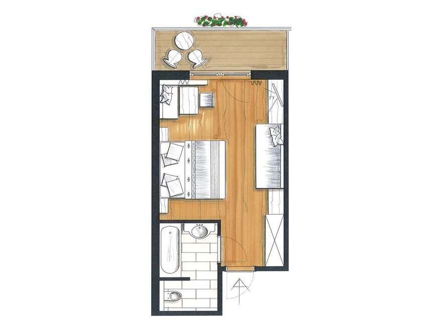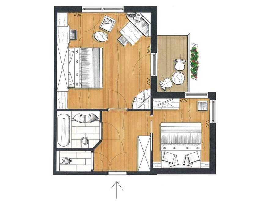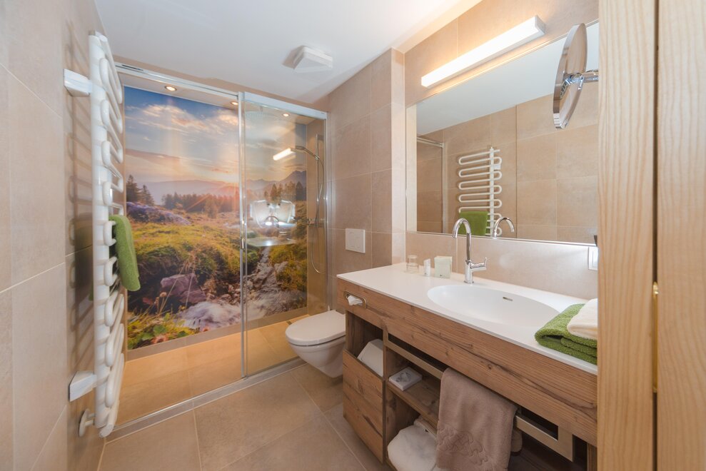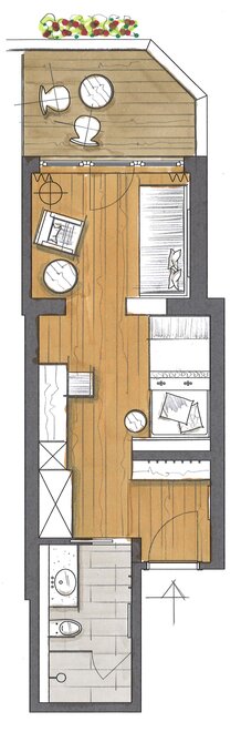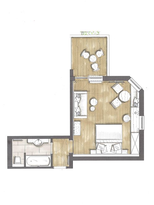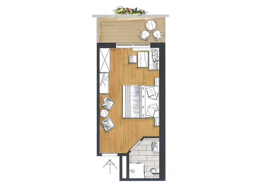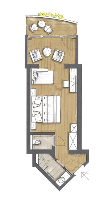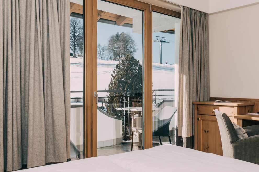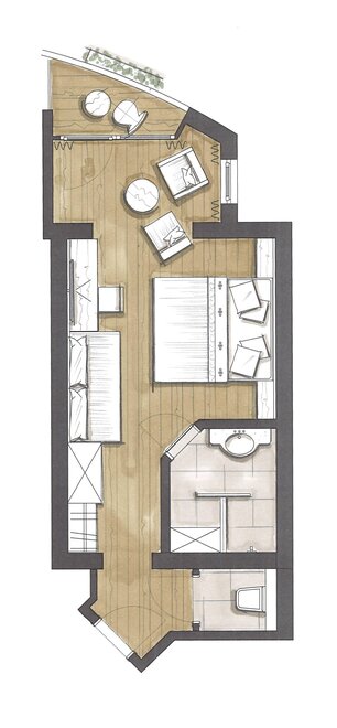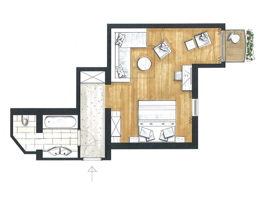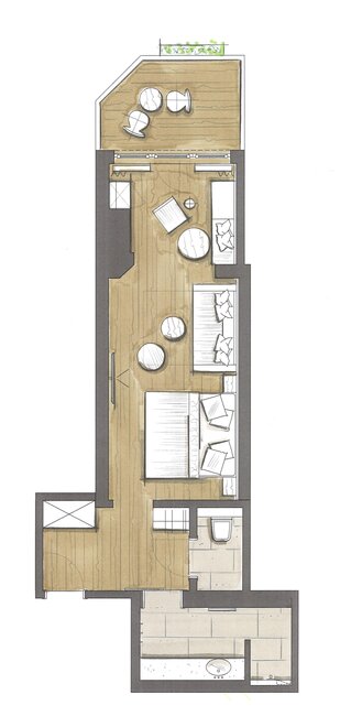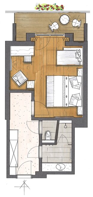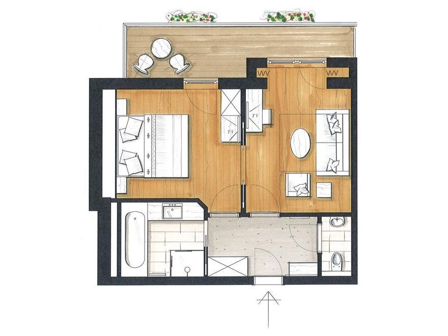 Prostorné apartmá v hlavní budově s jižním balkonem splňuje sny o dovolené. Protože vybavení z přírodního smrkového dřeva vytváří útulnou atmosféru a extra plochá obrazovka TV poskytuje zábavu v klidných dnech. Apartmá má oddělenou obytnou část. Koupelna se sprchou je oddělená od toalety a k dispozici je také kávovar na espresso a konvice na čaj.