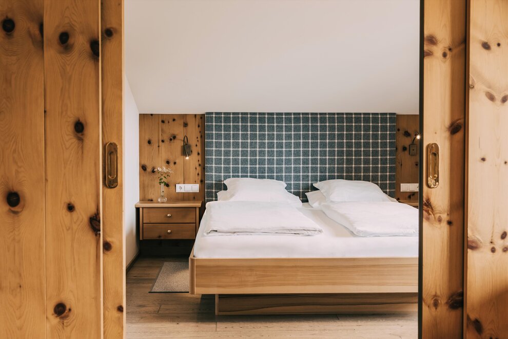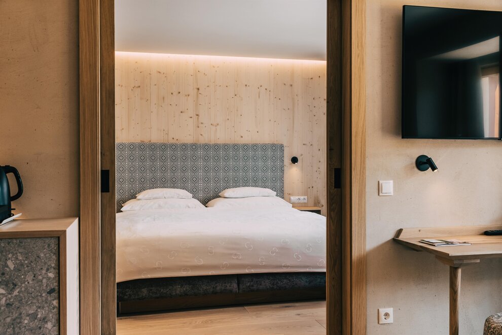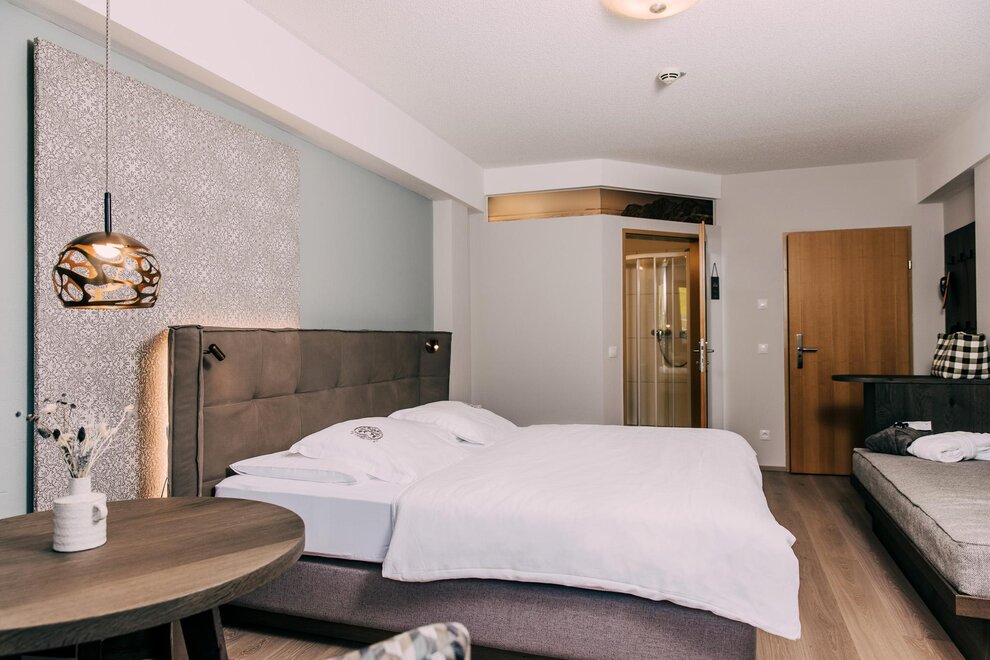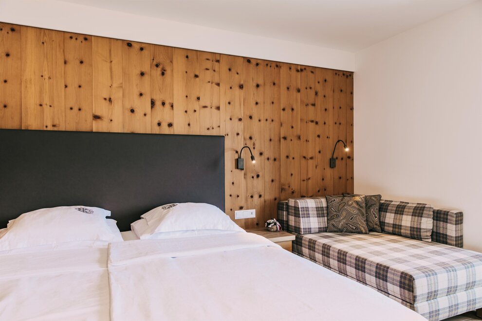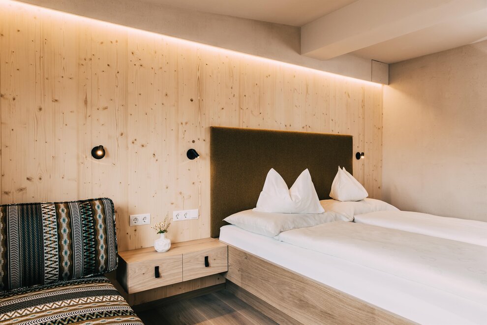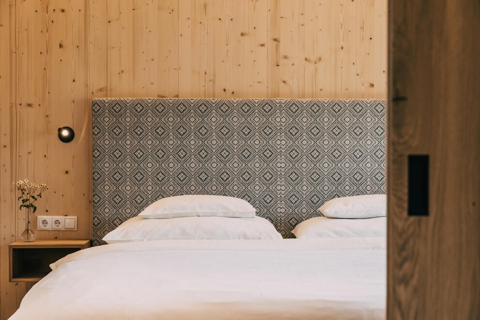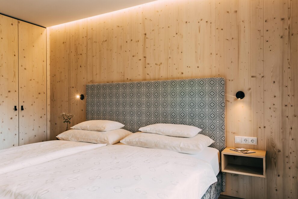 Úchvatné, nově zařízené dvojlůžkové pokoje s modřínovým starým dřevem a moderním designem, které lze v případě potřeby vybavit přistýlkou pro vaše dítě.