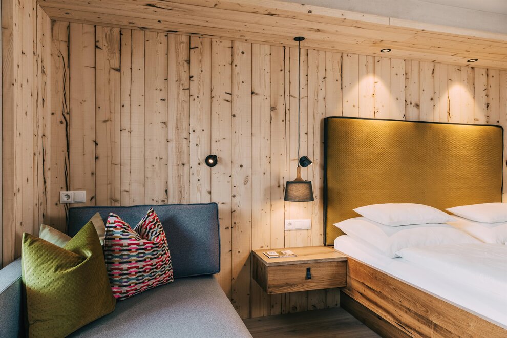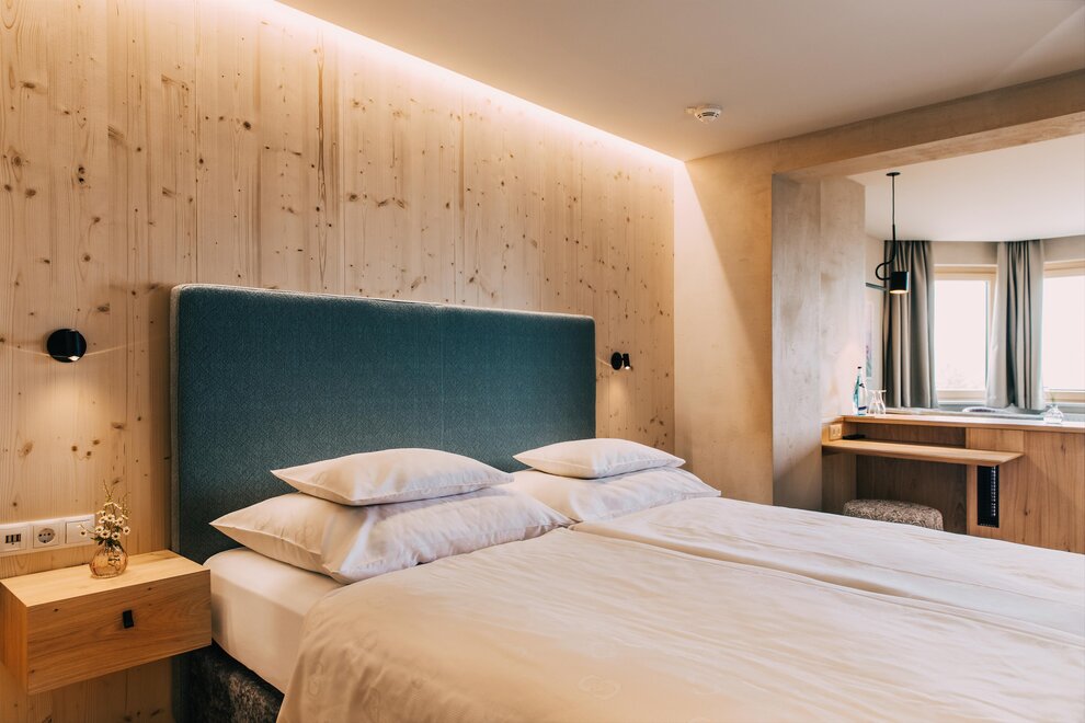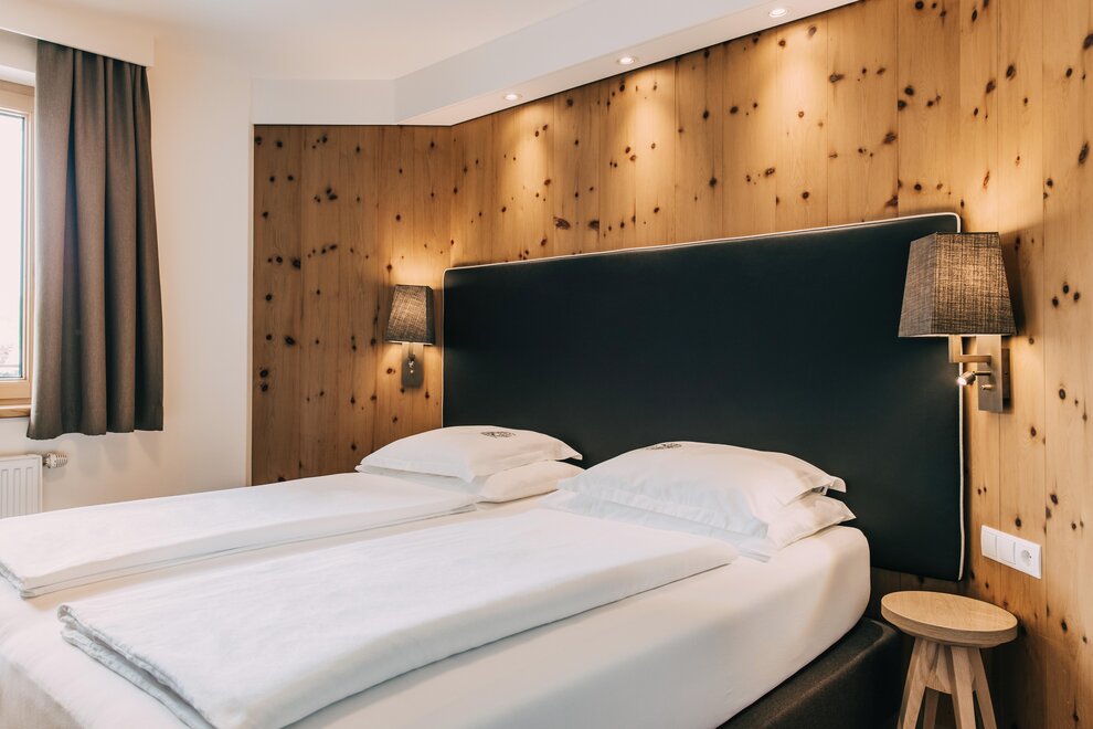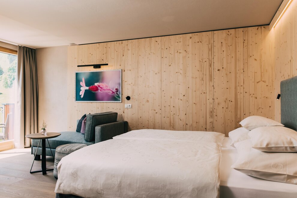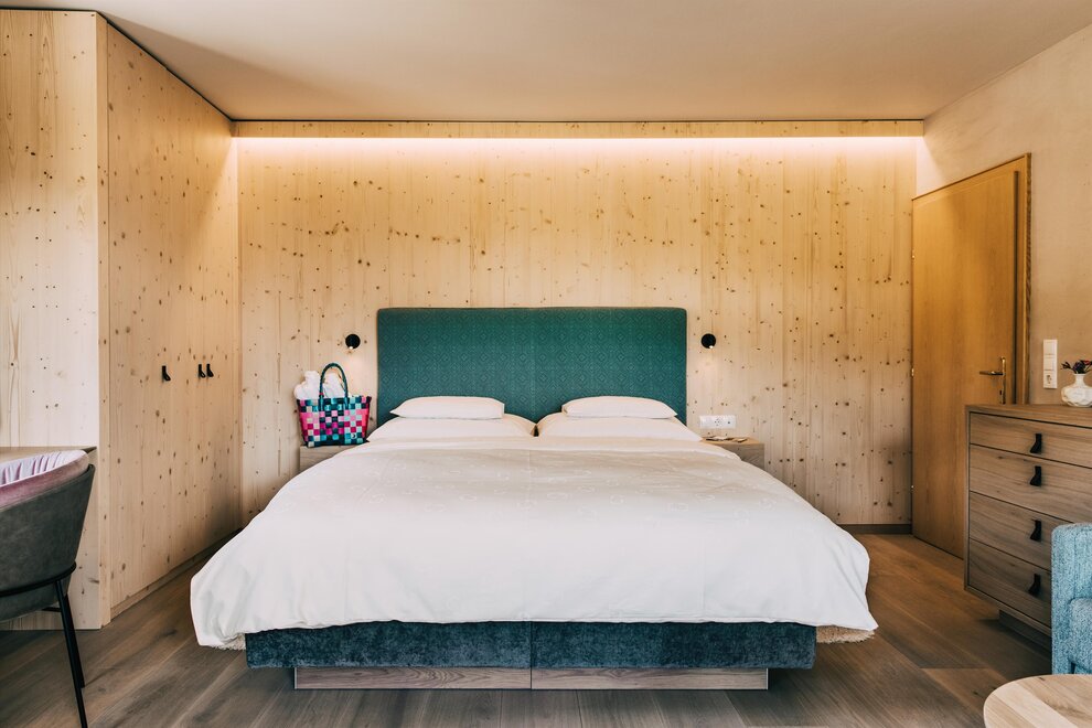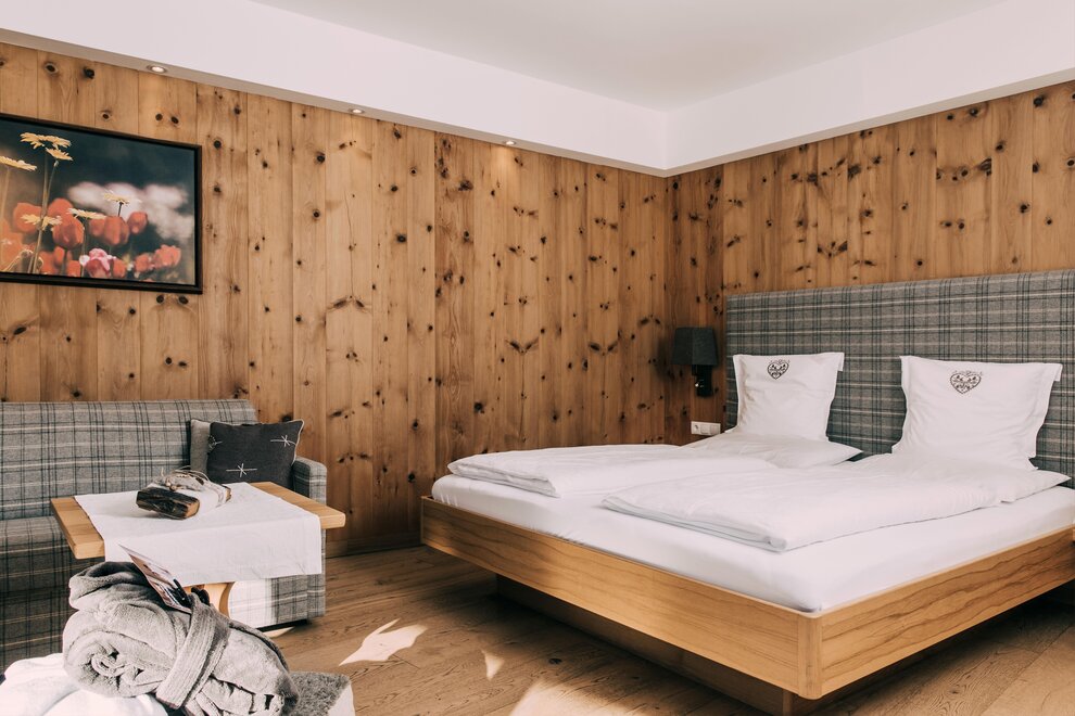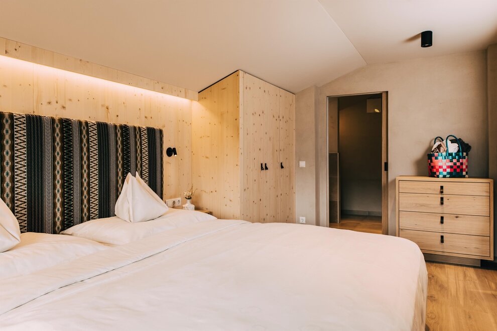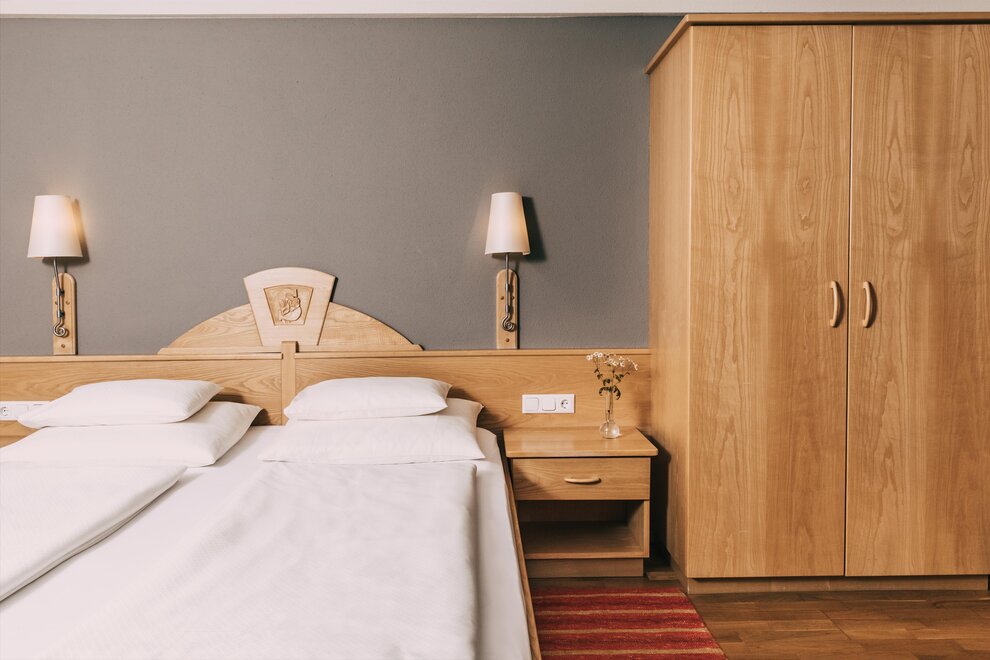 Úchvatné, nově zařízené dvojlůžkové pokoje s modřínovým starým dřevem a moderním designem, které lze v případě potřeby vybavit přistýlkou pro vaše dítě.