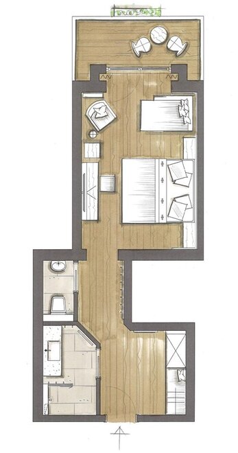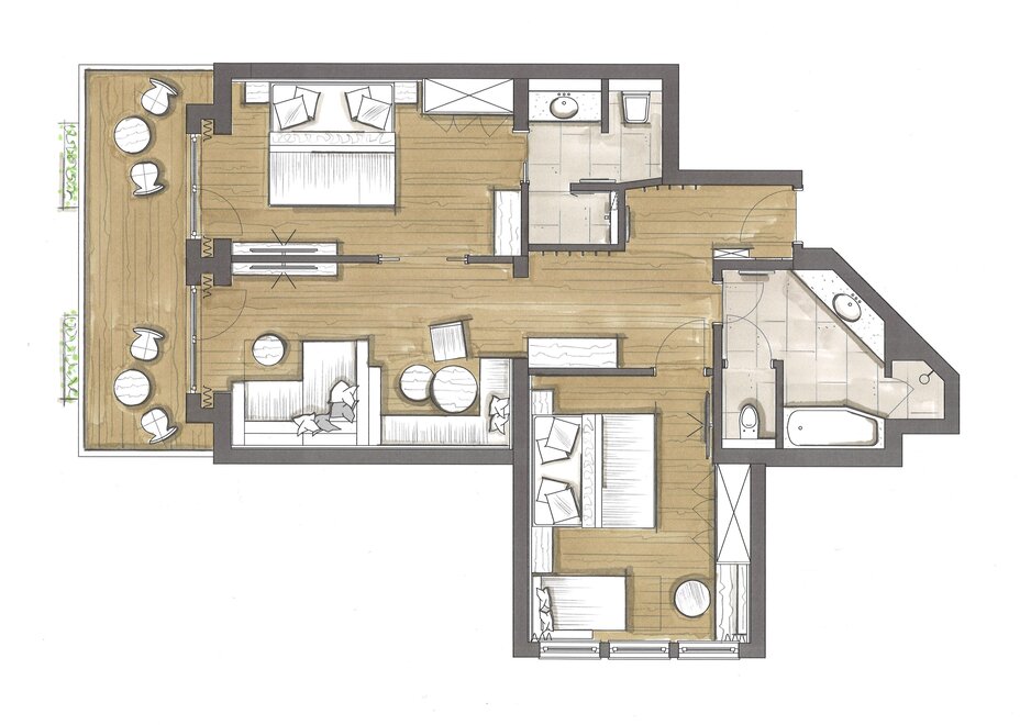Apartmá zařízené s modřínovým dřevem, sprcha a/nebo vana, WC částečně oddělené, balkon, plochá obrazovka TV a trezor. Částečně oddělená část pro bydlení. Velikost cca 38-39 m².