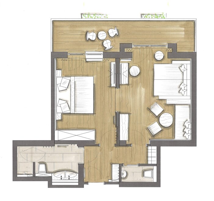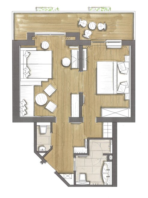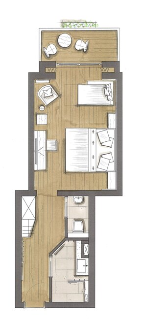 Slunné apartmá v hlavní budově s jižním balkonem je ideální pro rodiny. Jsou k dispozici dvě ložnice a extra obývací pokoj. Apartmá je rovněž perfektně vybaveno dvěma koupelnami (1x sprcha a 1x sprcha & vana), třemi plochými televizory, kávovarem na espresso a rychlovarnou konvicí.