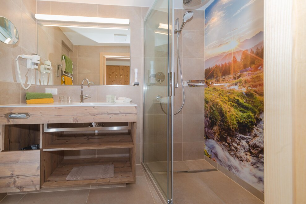 Familienzimmer Zirbe, ca 52 m² velké. Zařízeno s usínajícími přírodními materiály z borovice. Dva samostatné ložnice, jedna koupelna se sprchou a koupelnou nebo dvě koupelny se sprchami. Balkon, sejf, zdarma W-Lan, 2 ploché TV.