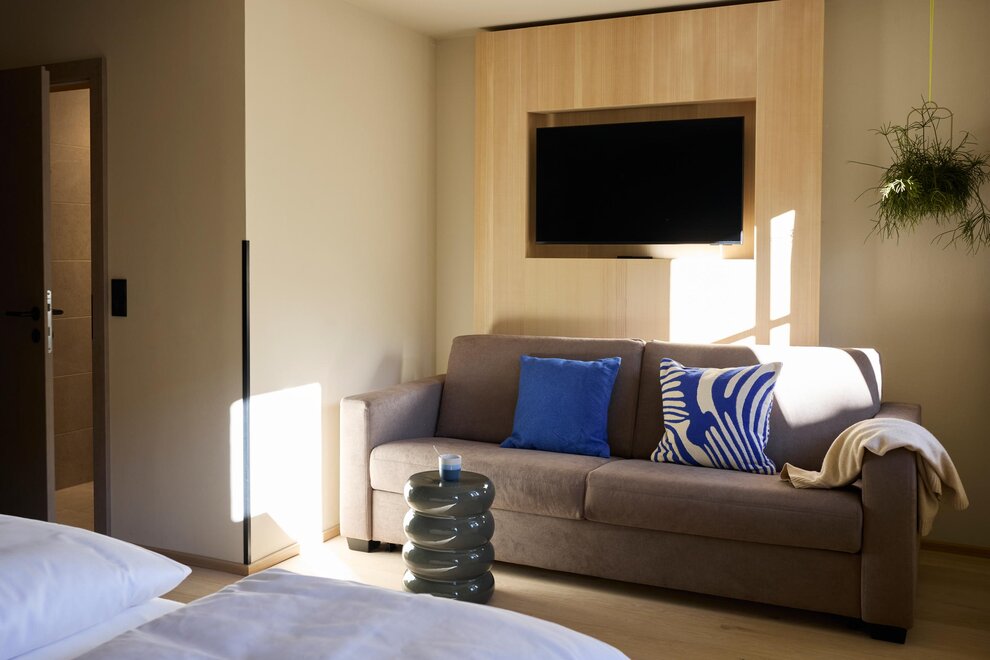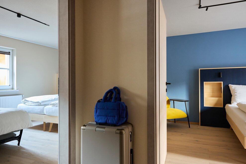 Se smart rozdělitelnou boxspring postelí a útulnou queensize postelí, rozdělenou na 2 ložnice plus předsíň, se v 31 m² velkém apartmá může pohodlně ubytovat až čtyři osoby. Také praktické: každá ložnice má svůj vlastní Smart a Netflix TV.