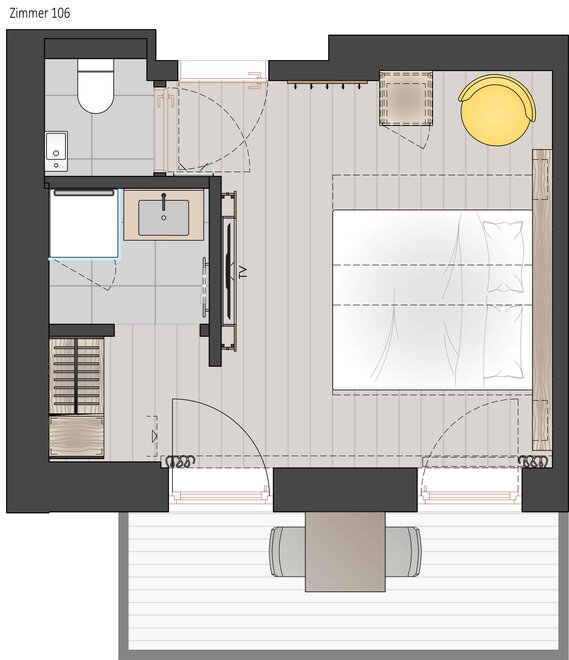 Dvoulůžkový pokoj má útulnou postel typu boxspring, koupelnu s extra WC a pracovní a lounge křeslo. Absolutním vrcholem je soukromá terasa s pohodlným lounge nábytkem.