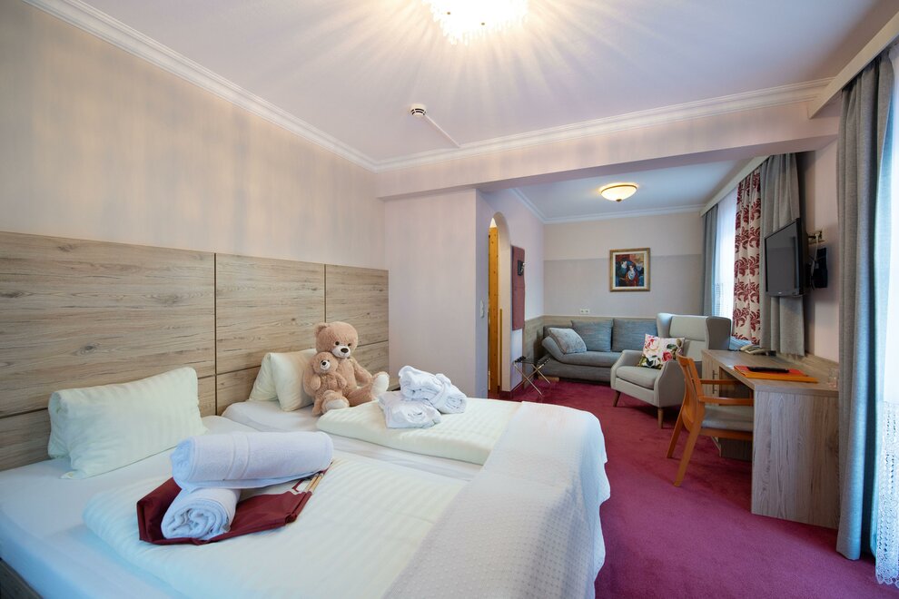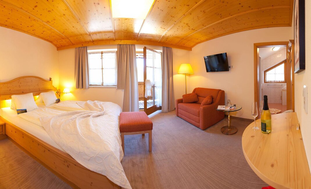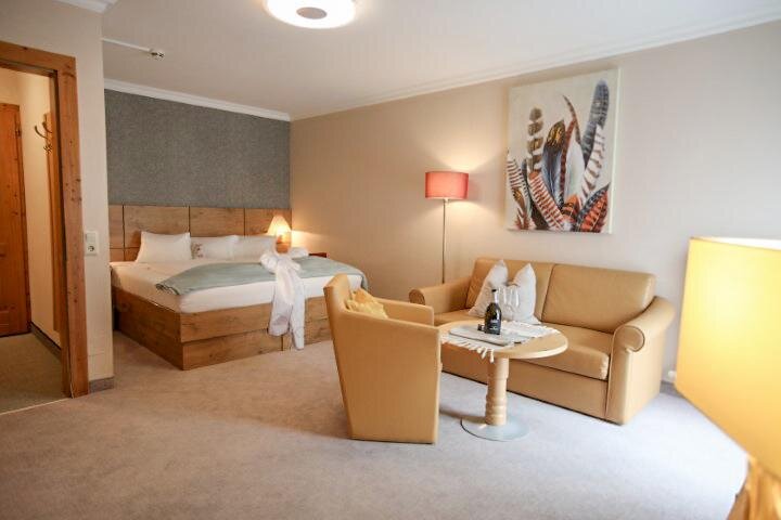 2 pokojové hotelové apartmány v nádherném místě s výhledem, včetně wellness oblasti s sprchou, WC, TV, trezorem, telefonem, fénem, částečně balkonem, 2 oddělené ložnice. Všechny pokoje jsou v obytném, venkovském stylu. Částečně s kuchyňským koutem. Ideální pro rodiny nebo pro 2 osoby pro prostornou obytnou část.