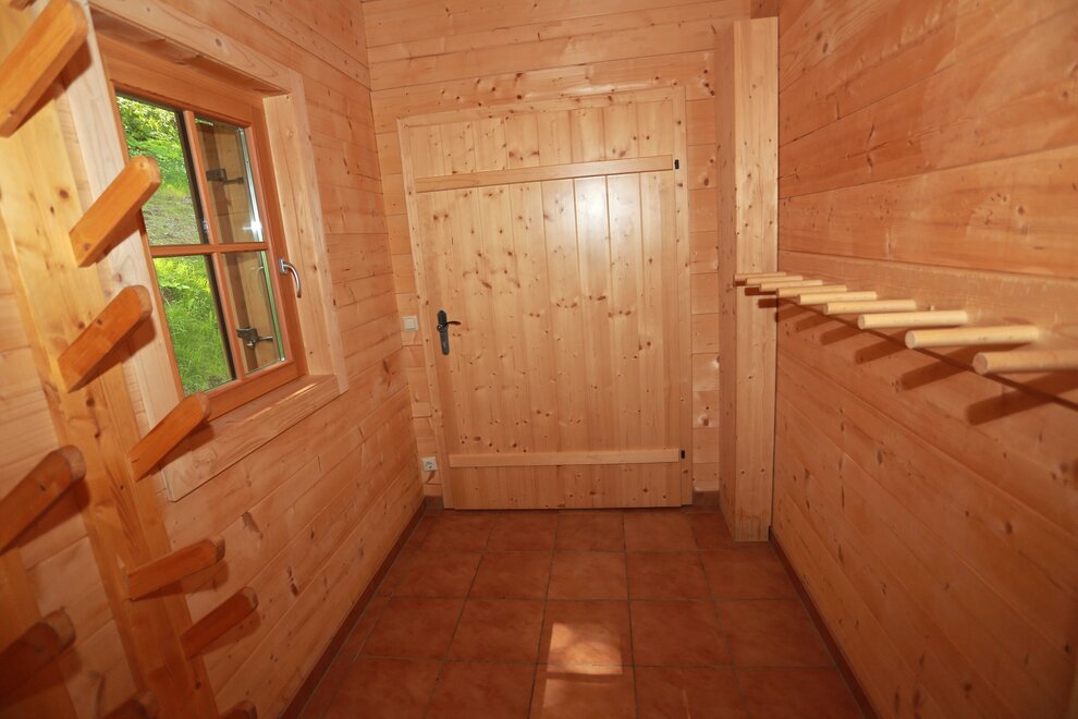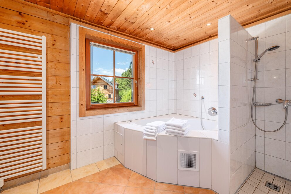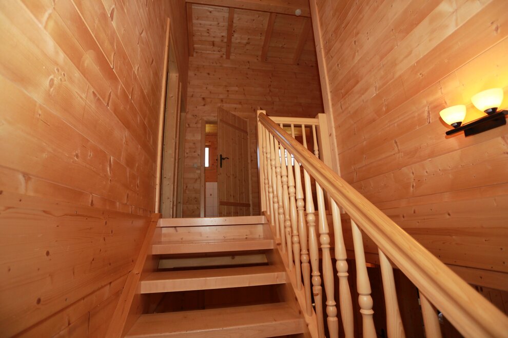 Všechny 6 jsou kompletně dřevěné, pohodlně a velmi útulně zařízené. Přízemí: Velká chata (cca 30 m²) s posezením, DVD/CD přehrávačem, SAT-TV, pohovkou, krbovými kamny a perfektně vybavenou kuchyní s elektrickým sporákem, troubou, lednicí s malým mrazákem, myčkou, mikrovlnnou troubou, kávovarem, rychlovarnou konvicí, toustovačem a výstupem na slunnou terasu s lavicí a grilem. Koupelna se saunou, 2 sprchovými kouty a vířivkou. 1 WC. Patro: 2 dvoulůžkové pokoje, 2 pokoje pro 2 - 4 osoby s 1 manželskou postelí a rozkládací pohovkou, 2 sprchy/WC, 1 WC. Chaty mají centrální topení a částečně podlahové topení. Prosíme, nekuřte prosím v chatách a v apartmánu!