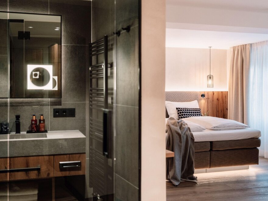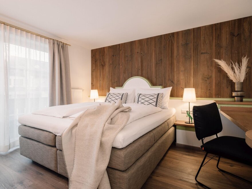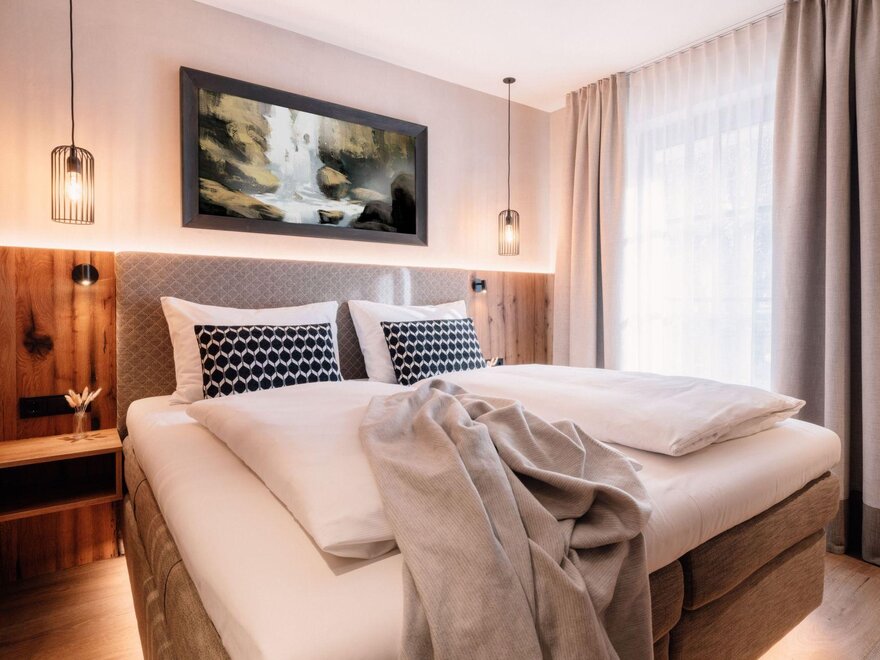 #dvojlůžkový pokoj standardPohodlný, alpský, městský. Pro všechny, kteří si přejí víc místa k relaxaci. Dva na dovolené v ZWEIklang. S uzavřenou koupelnou.