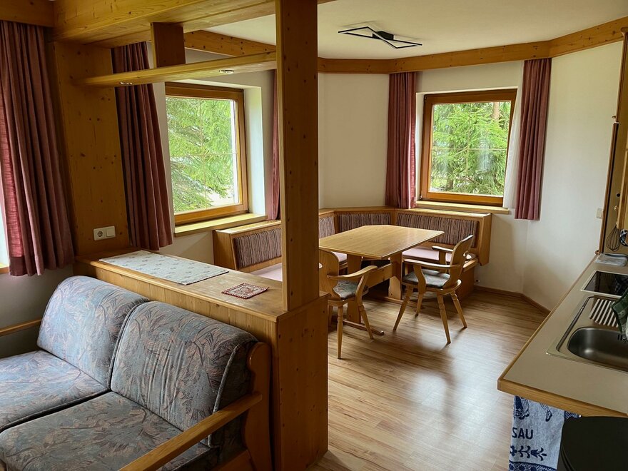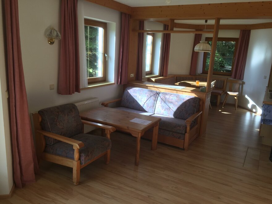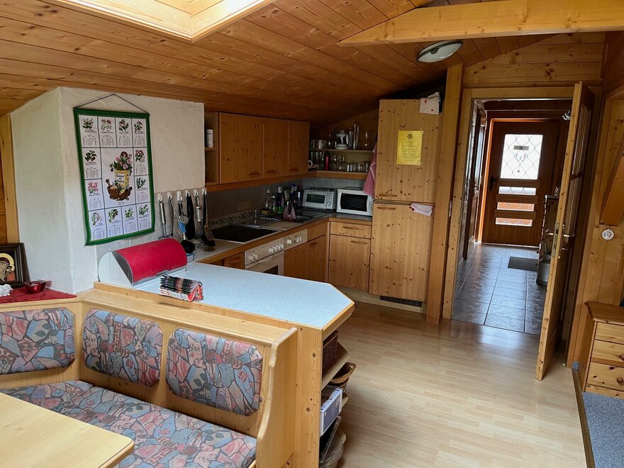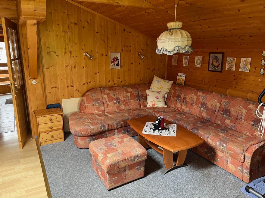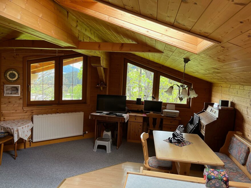 Útulný apartmán v podkroví o rozloze 60 m², obývací pokoj s rozkládací sedačkou, 1 ložnice, koupelna, WC, kuchyň a nádherný výhled na plato Ramsau a Tauern.