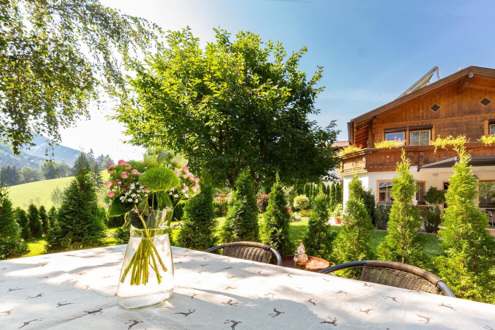 Enjoy your holiday in our completely furnished apartment with a fully equipped kitchen. Included are bed linen as well as towels, kitchen equipment with sponge, towel, cleaning soap and dishwasher tablets. In the bathroom there's shower gel, soap and toilet paper provided. Additionally you can rent bath robes (EUR 5,-/item) and have your textiles washed (EUR 5,-/washing machine up to 5kg, EUR 5,-/tumble drier, disclaimed liability). There's a Cafissimo coffee machine available, different kinds of coffee can be bought with us. The apartment is equipped with a minibar, with common refreshing drinks as well as alcoholics. On request we serve a well chosen breakfast buffet to the apartment, also vegetarian or vegan or in a power-skier-variant. Use of the garden with deckchairs or the gas-bbq is included.
