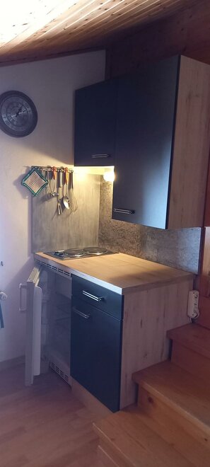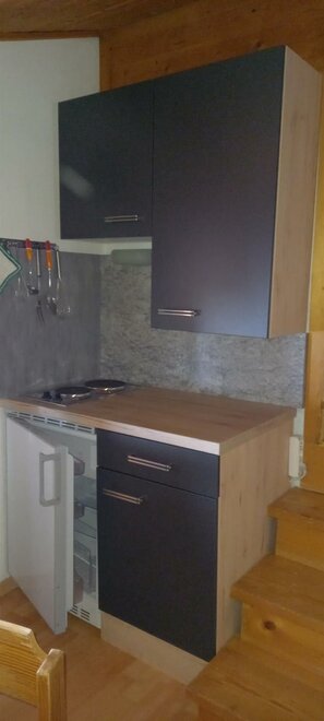 Kuchyňský kout se sedací soupravou, vybavený chladničkou, vařičem, nádobím, kávovarem, mikrovlnnou troubou atd.