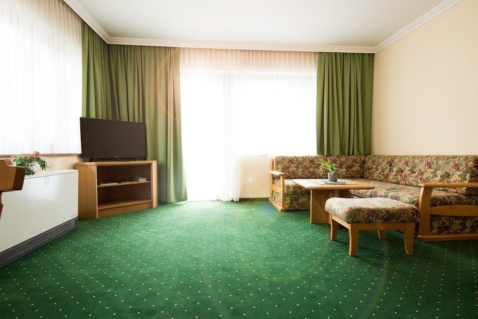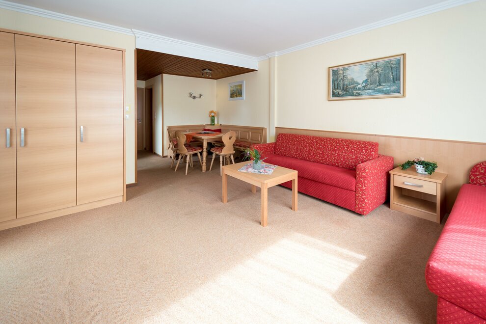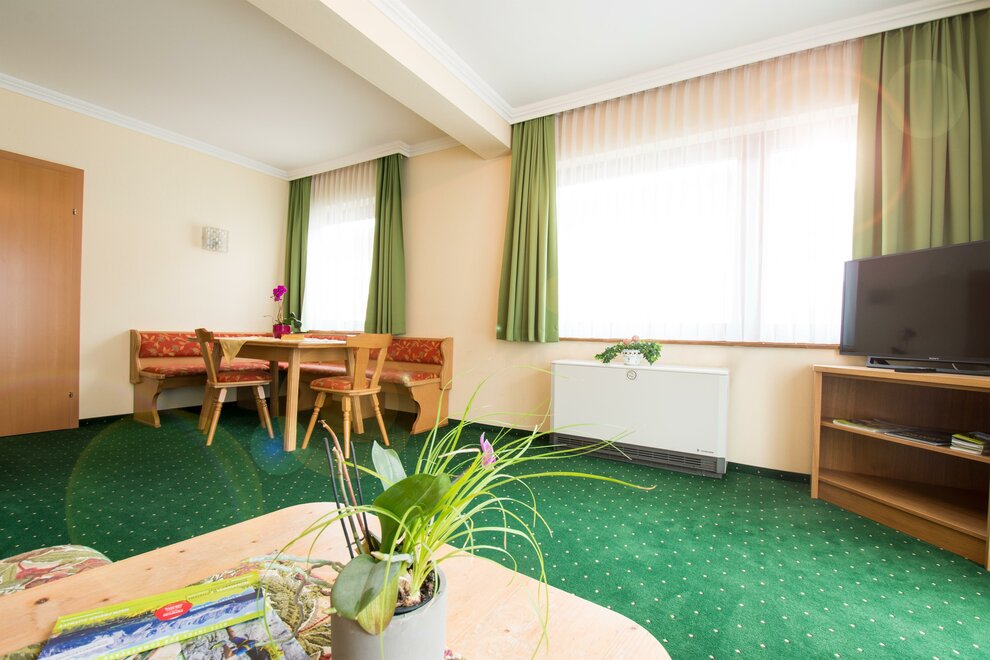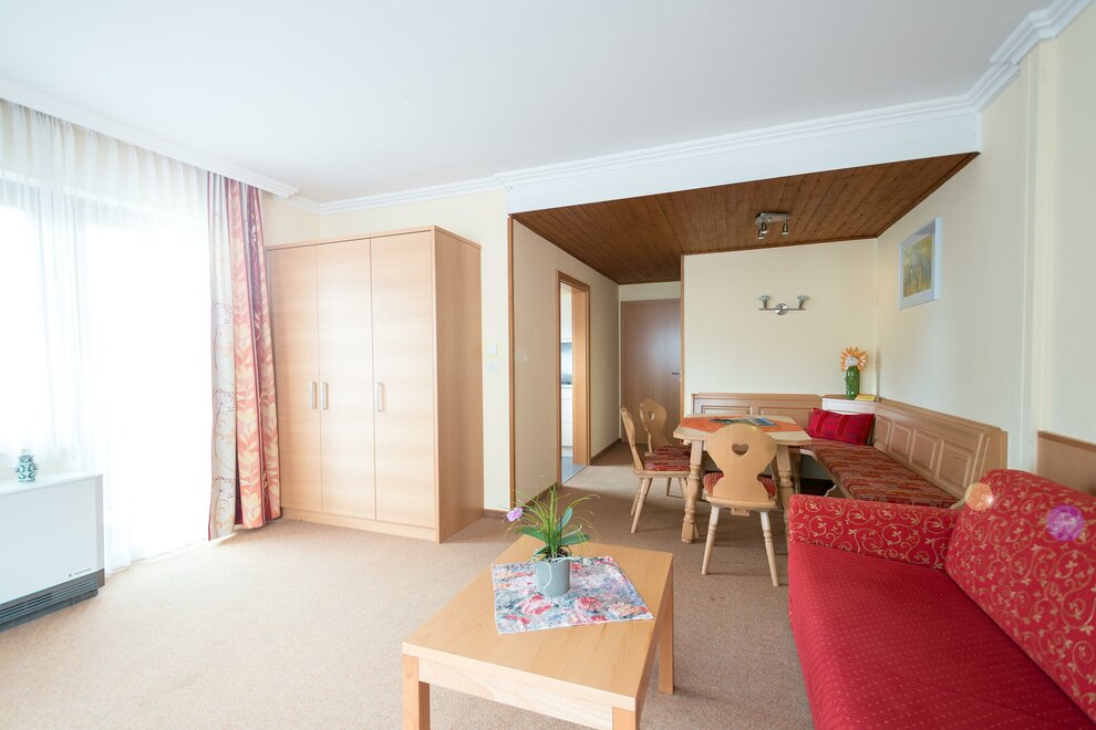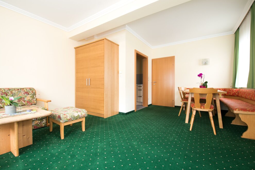 Apartmán Typ A, č. 2 v 1. patře (východ) s přibližně 68 m² pro 4 až 6 osob, skládající se z předsíně, 2 ložnic, velkého obývacího pokoje s rozkládací pohovkou kuchyně, 3 samostatné hygienické místnosti (koupelna, sprcha, WC) balkon