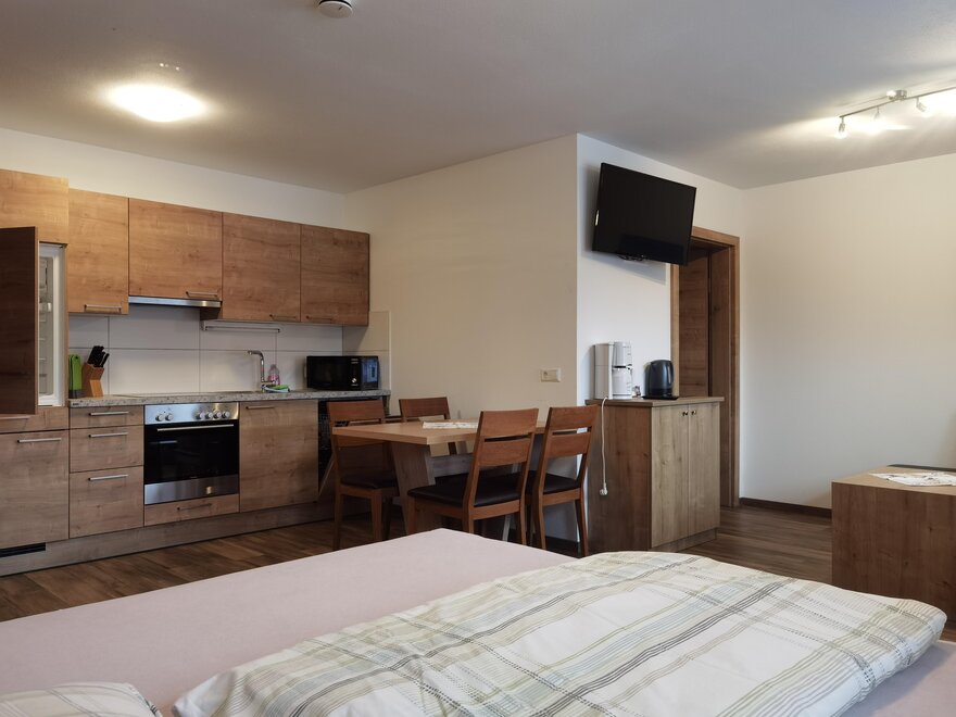 V naší novostavbě se nacházejí 3 apartmány s plně vybavenou kuchyní, ložnicí, koupelnou a samostatným WC. K dispozici je také lyžárna se sušičkou na boty. Wi-Fi zdarma. Služba donášky pečiva je k dispozici na vyžádání.