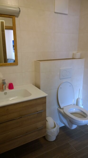 Skládá se z prostorné místnosti s kuchyňským koutem (kompletně vybaveným včetně rychlovarné konvice a kávovaru), obývací části (s televizí) se rozkládací pohovkou a manželskou postelí (lořní prádlo je k dispozici). Druhá místnost zahrnuje koupelnu se sprchou, WC a umyvadlem (ručníky a osušky, stejně jako toaletní papír jsou k dispozici).