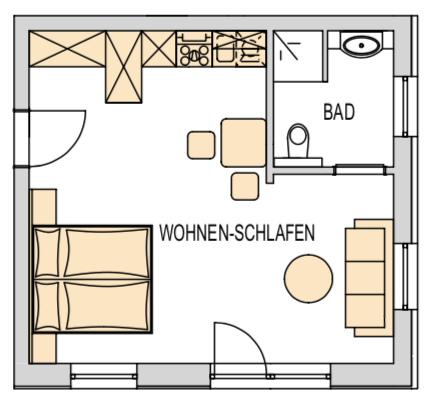 Studio I je apartmán se 2 pokoji v přízemí (žádné schody) pro max. 4 osoby.