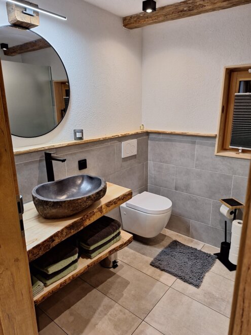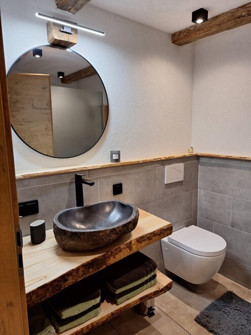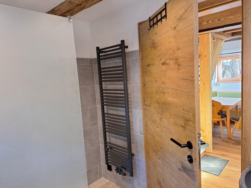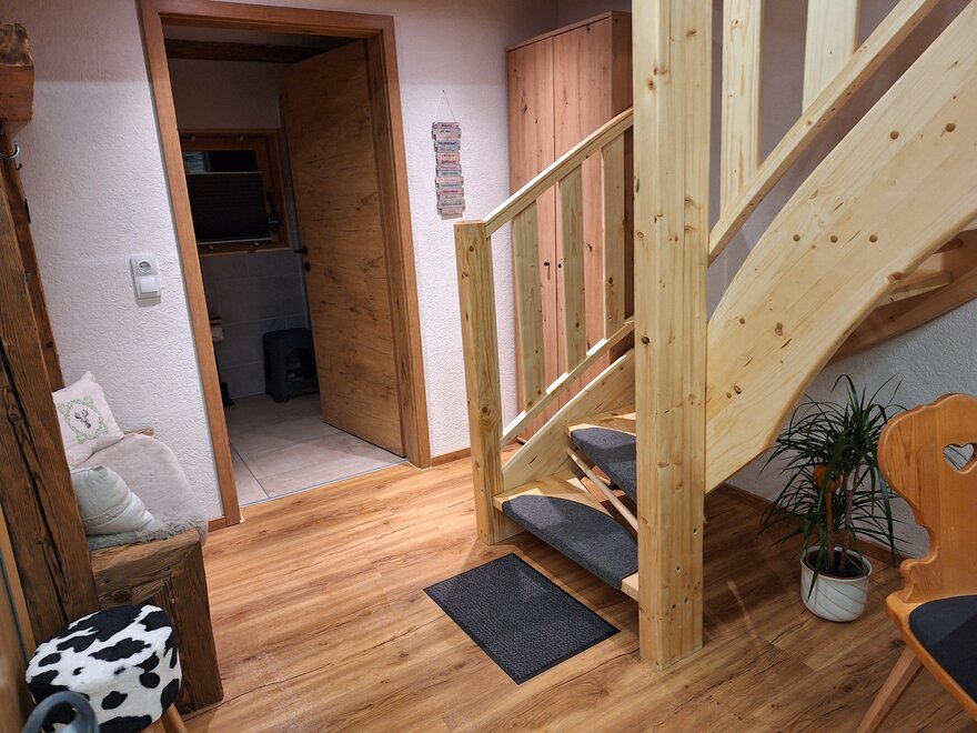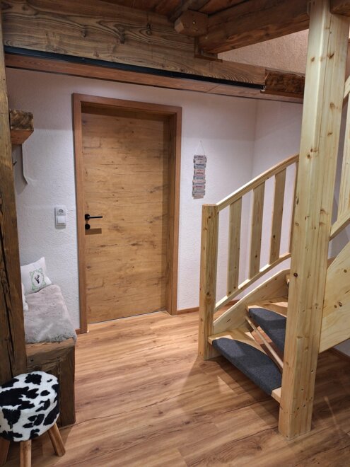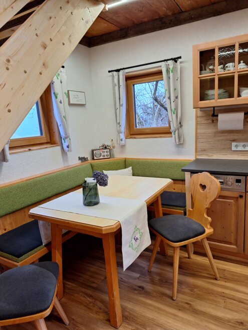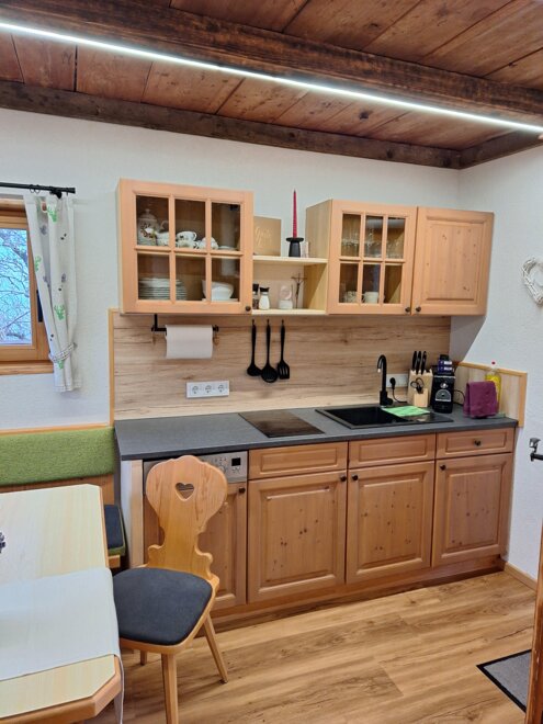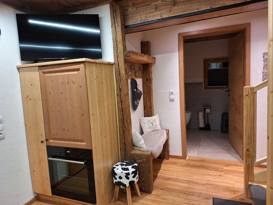 Naš Troadkasten je rustikálně-moderně zařízený apartmán. V přízemí je plně vybavená kuchyně se myčkou, lednicí, kávovarem atd., útulný rohový pult s výhledem na televizi, šatna a moderní koupelna se sprchou a WC.