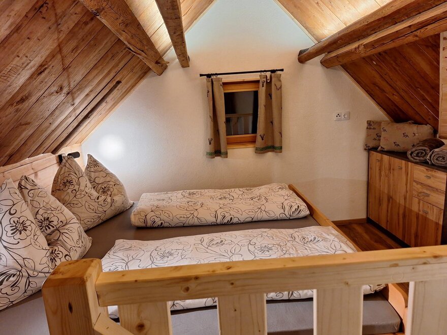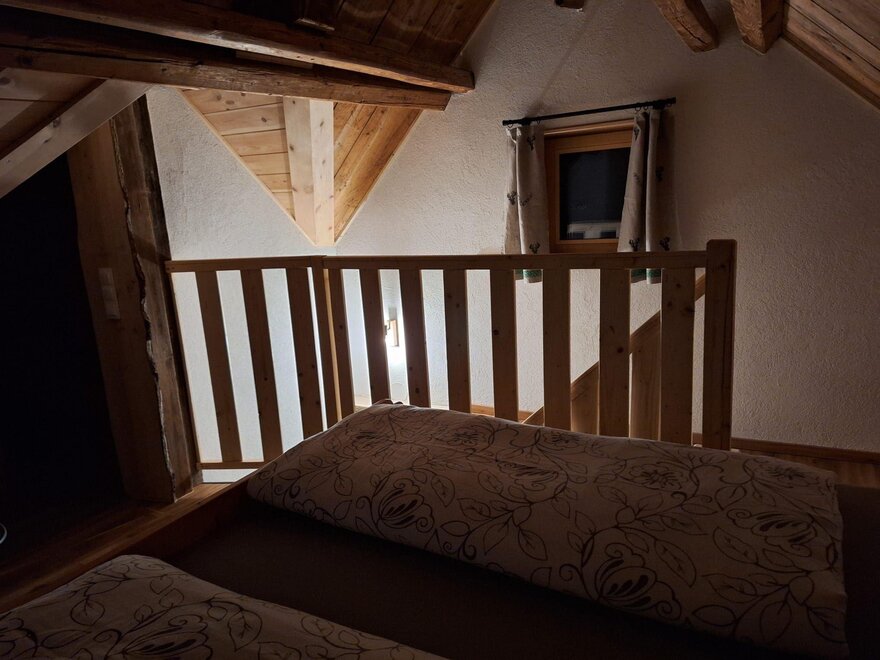 V patře jsou dvě spací niky s manželskou postelí a dvěma jednolůžky a dostatek úložného prostoru na oblečení.