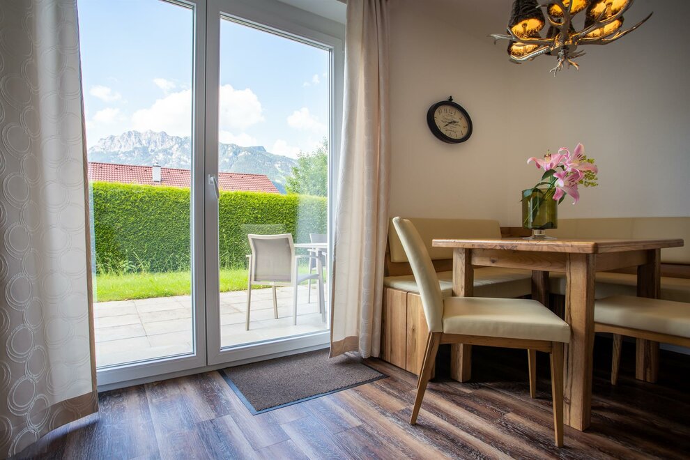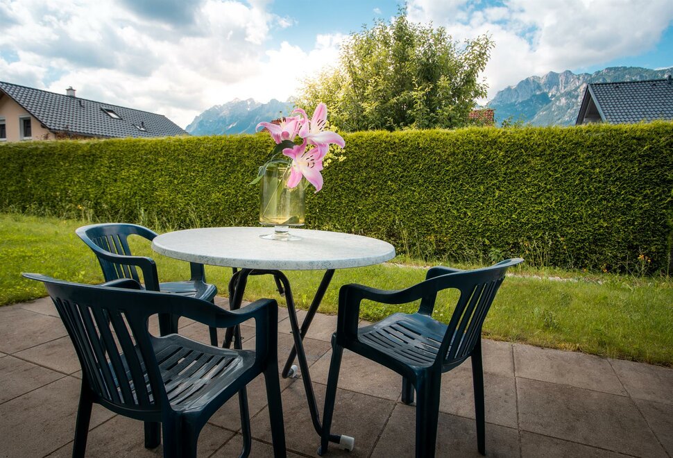 - Záwest-nord-východ terasa s zahradním nábytkem a skvělým výhledem na hory