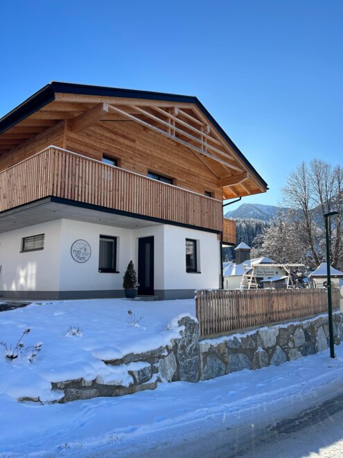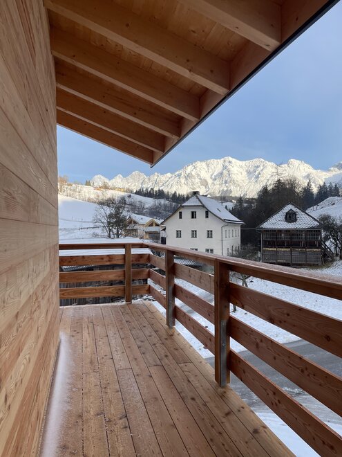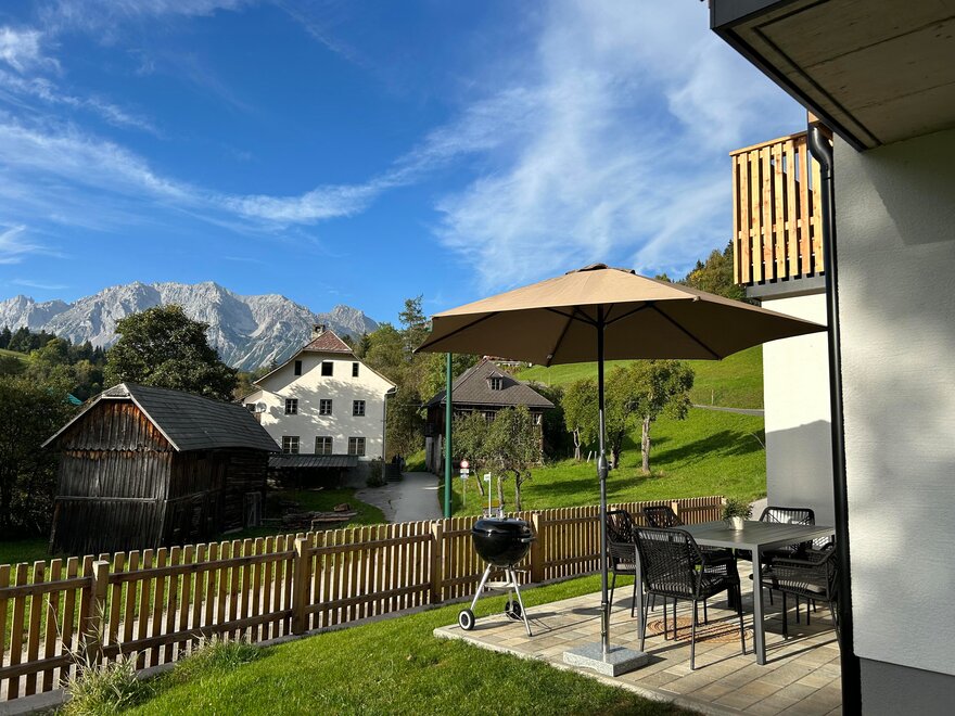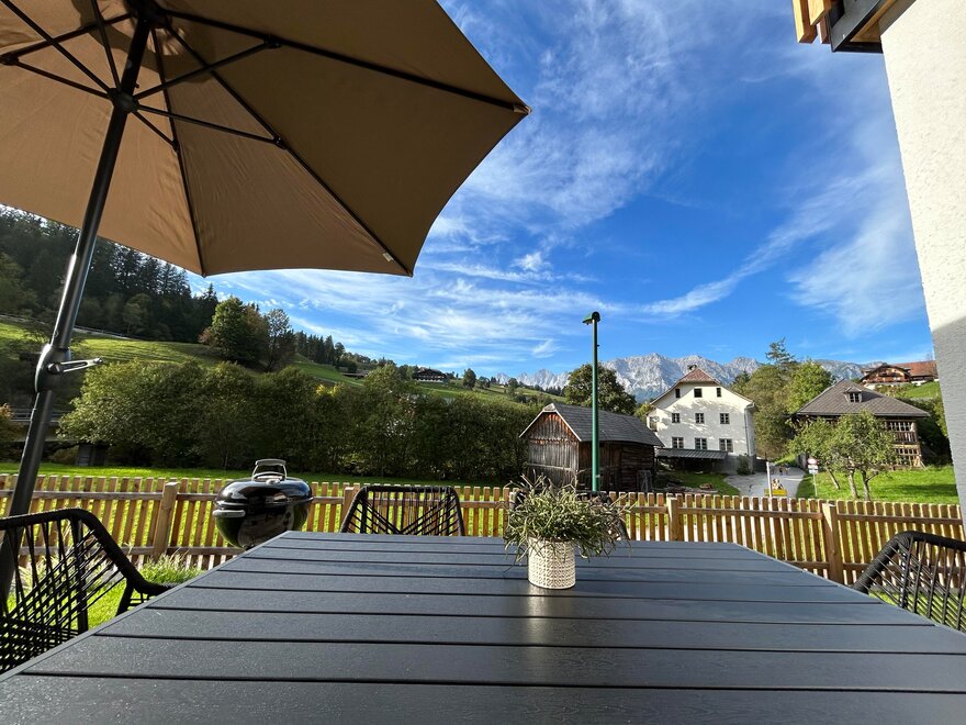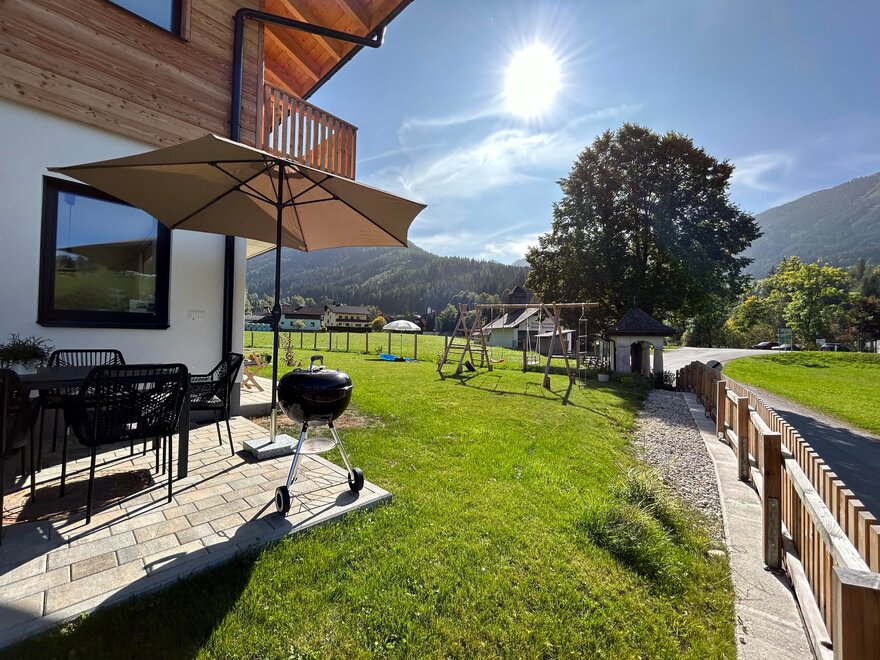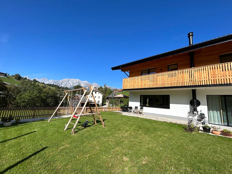 - zahradou a terasou s hřištěm a balkonem s výhledem na Dachstein, ideální pro grilování, hraní, slunění, odpočinek, pití piva a vína