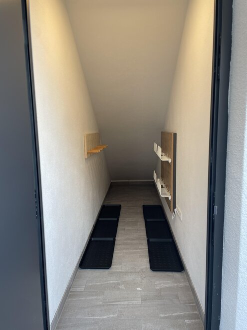 Uzamykatelná lyžárna, prostor na boty a na kola se sušičem na boty a možnostmi nabíjení pro E-biky.