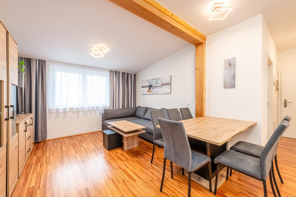 2 ložnice s manželskou postelí a rozkládacím gaučem pro 2 další osoby v obývacím pokoji nabízejí celkem místo pro 6 osob. Plně vybavená kuchyň zve ke společnému vaření. Moderní koupelna se sprchou a samostatné WC zajišťují další pohodlí. Bezplatné parkování je k dispozici přímo u apartmánu.